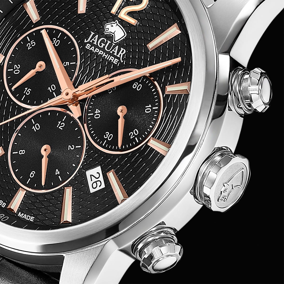 Мужские швейцарские часы-хронографХронографФункция позволяет измерять отрезки времени с особой точностью: часы, минуты, секунды. Верным признаком хронографа является наличие на циферблате 3 дополнительных окошек-счётчиков. Jaguar Acamar J968/6. Кварцевый швейцарский калибр RONDA 5030D. Сапфировое стеклоСапфировое стеклоПрочный и надёжный материал из кристалла сапфира синтетического происхождения, характеризующийся особой твёрдостью и устойчивостью к царапинам и повреждениям. устойчивое к мелким механическим повреждениям. Корпус часов изготовлен из нержавеющей стали. Окошко даты находится в положении между 4 и 5 часов. Класс водозащиты: 50 метров, позволит защитить корпус от случайных брызг или капель дождя. Кожаный ремешок на стандартной застёжке.