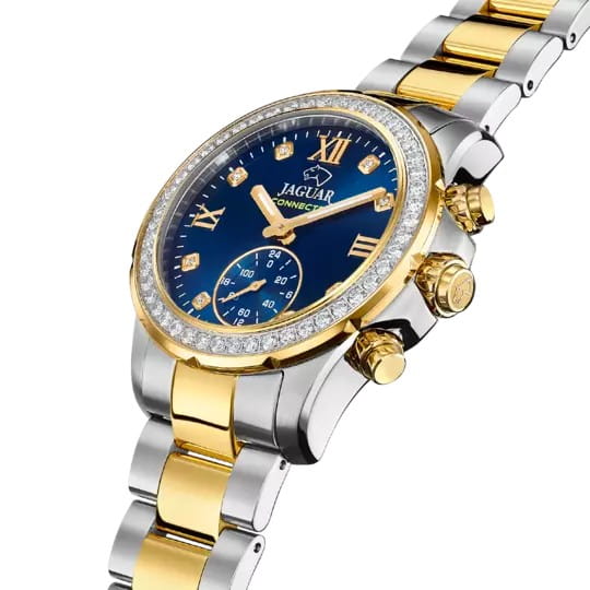 Женские швейцарские часы Jaguar Connected Lady J982/3. Сапфировое стеклоСапфировое стеклоПрочный и надёжный материал из кристалла сапфира синтетического происхождения, характеризующийся особой твёрдостью и устойчивостью к царапинам и повреждениям. устойчивое к мелким механическим повреждениям. Корпус часов изготовлен из нержавеющей стали. Стрелки с люминесцентным покрытиемЛюминесцентное покрытиеПозволяет считывать показания времени в темноте. Производители наносят на стрелки, часовые индексы, безель или поверхность циферблата светонакопительный состав, дающий холодное свечение.. Класс водозащиты: 50 метров, позволит защитить корпус от случайных брызг или капель дождя. БезельБезельВнешний ободок, закрепляющий стекло. В спортивных часах так называется поворотное кольцо с делениями на циферблате, выполняет роль таймера – замеряет отрезки времени на шкале. Неподвижный безель – элемент декора. Однонаправленно вращающийся безель на дайверских часах позволяет фиксировать моменты погружения и выныривания на поверхность. с PVD-покрытиемPVDУльтратонкое покрытие наносится в технике вакуумного напыления, сочетает в себе нитрид титана особой прочности со слоем золота или оксида хрома. Несёт в себе декоративную или защитную функцию. и циферблат инкрустированы цирконием. Стальной браслет с частичным PVD-покрытиемPVDУльтратонкое покрытие наносится в технике вакуумного напыления, сочетает в себе нитрид титана особой прочности со слоем золота или оксида хрома. Несёт в себе декоративную или защитную функцию. на раскладной застёжкеРаскладная застёжкаТакой тип застёжки используется только на браслетах из металла. Она никогда не раскрывается полностью, происходит разделение на 2 и более частей. Раскладывающая застёжка снизит вероятность потери часов к минимуму.. За точный ход работы часов, из коллекции Connected, отвечает кварцевый гибридный механизм швейцарского производства со Смарт-Модулем. Данный тип механизма обеспечивает возможность подключить часы к телефону через Bluetooth и управлять большим рядом дополнительных функций на выбор с помошью приложения Jaguar. Дополнительные функции: отображение даты и дня недели, секундомер, таймер, GMT, шагомер, поиск телефона, включение/выключение звука телефона при входящих вызовах, переключение музыки, вибро-уведомления.