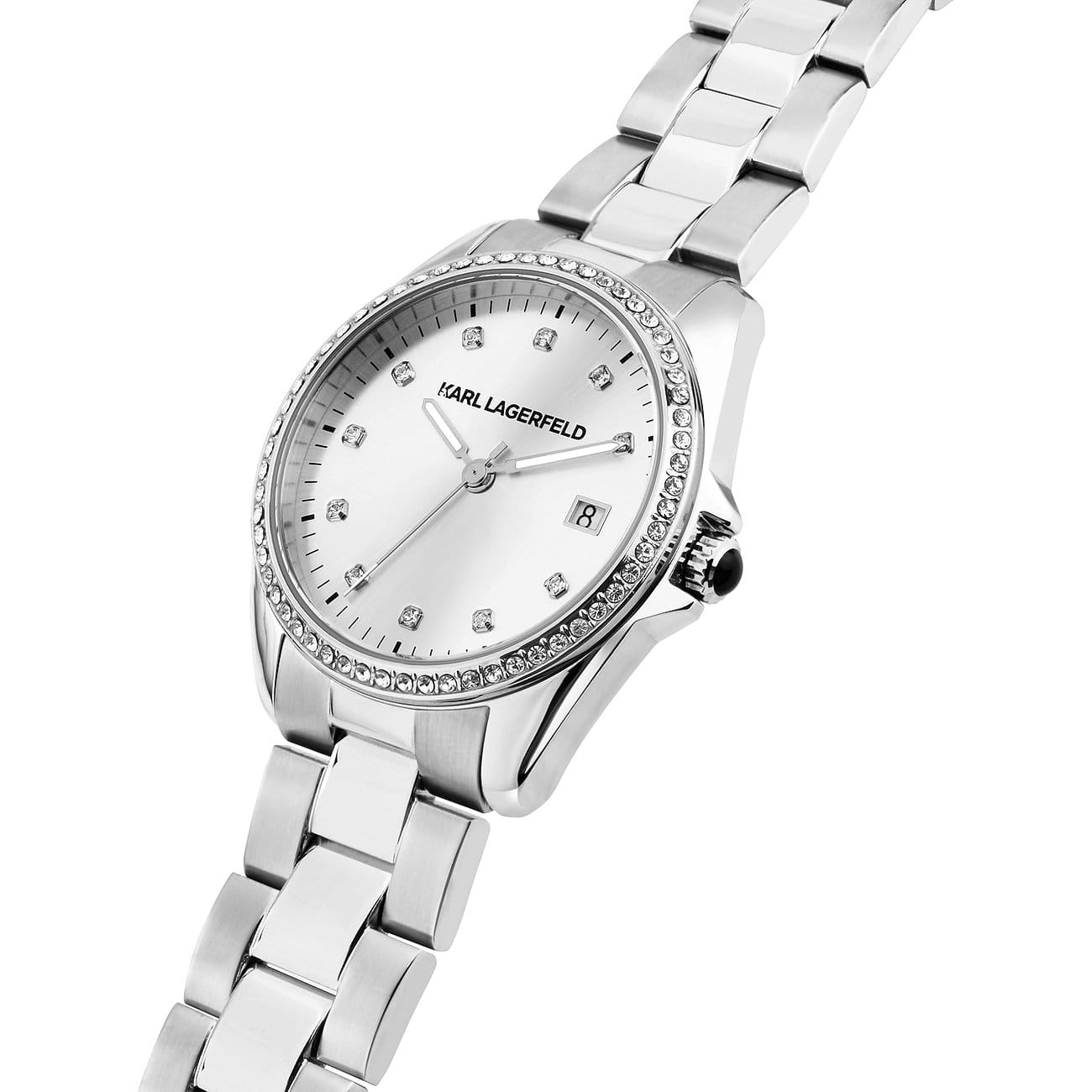 Женские элегантные часы Karl Lagerfeld Round Essentials R0553101510, кварцевый механизм с высокой точностью. Минеральное стеклоМинеральное стеклоМинеральное стекло представляет собой искусственно выращенный минерал кварца. Такое стекло отличается особой устойчивостью к повреждениям и царапинам. Уступает по некоторым качествам сапфировому стеклу. устойчивое к появлению царапин, обладающее высокой прозрачностью. Изысканный корпус изготовлен из нержавеющей стали. Лаконичные центральные часовая, минутная и секундная стрелки. Водонепроницаемость 5 АТМ позволяет использовать часы в повседневных условиях — при мытье рук или под лёгким дождём. Стальной браслет c раскладной застёжкойРаскладная застёжкаТакой тип застёжки используется только на браслетах из металла. Она никогда не раскрывается полностью, происходит разделение на 2 и более частей. Раскладывающая застёжка снизит вероятность потери часов к минимуму., обеспечивающей комфорт и уверенную фиксацию на запястье, а также добавляя завершающий штрих к этому стильному аксессуару. Стрелки оснащены люминесцентным покрытиемЛюминесцентное покрытиеПозволяет считывать показания времени в темноте. Производители наносят на стрелки, часовые индексы, безель или поверхность циферблата светонакопительный состав, дающий холодное свечение., обеспечивающим хорошую читаемость в темноте. Циферблат и безельБезельВнешний ободок, закрепляющий стекло. В спортивных часах так называется поворотное кольцо с делениями на циферблате, выполняет роль таймера – замеряет отрезки времени на шкале. Неподвижный безель – элемент декора. Однонаправленно вращающийся безель на дайверских часах позволяет фиксировать моменты погружения и выныривания на поверхность. с кристаллами подчёркивают изысканный характер часов, создавая универсальный образ, подходящий как для повседневных ситуаций, так и для особых случаев. Аккуратное окошко даты на отметке «3 часов».
