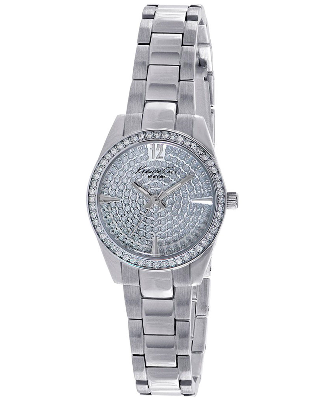 Женские кварцевые часы с минеральным стекломМинеральное стеклоМинеральное стекло представляет собой искусственно выращенный минерал кварца. Такое стекло отличается особой устойчивостью к повреждениям и царапинам. Уступает по некоторым качествам сапфировому стеклу. Kenneth Cole Classic IKC4979, кварцевый механизм с высокой точностью. Корпус часов изготовлен из стали с IP-покрытиемIP-покрытиеМетод ионного напыления. Демонстрирует повышенную устойчивость к истиранию, окислению и химическим веществам. Под воздействием высокого давления и температуры около 1500°C молекулы металла надёжно соединяются с частицами корпуса часов.. БезельБезельВнешний ободок, закрепляющий стекло. В спортивных часах так называется поворотное кольцо с делениями на циферблате, выполняет роль таймера – замеряет отрезки времени на шкале. Неподвижный безель – элемент декора. Однонаправленно вращающийся безель на дайверских часах позволяет фиксировать моменты погружения и выныривания на поверхность. и циферблат инкрустированы кристаллами. Стрелки с люминесцентным покрытиемЛюминесцентное покрытиеПозволяет считывать показания времени в темноте. Производители наносят на стрелки, часовые индексы, безель или поверхность циферблата светонакопительный состав, дающий холодное свечение.. Класс водозащиты: 30 метров, позволит защитить корпус от случайных брызг или капель дождя. Стальной браслет с IP-покрытиемIP-покрытиеМетод ионного напыления. Демонстрирует повышенную устойчивость к истиранию, окислению и химическим веществам. Под воздействием высокого давления и температуры около 1500°C молекулы металла надёжно соединяются с частицами корпуса часов. на раскладной застёжкеРаскладная застёжкаТакой тип застёжки используется только на браслетах из металла. Она никогда не раскрывается полностью, происходит разделение на 2 и более частей. Раскладывающая застёжка снизит вероятность потери часов к минимуму..