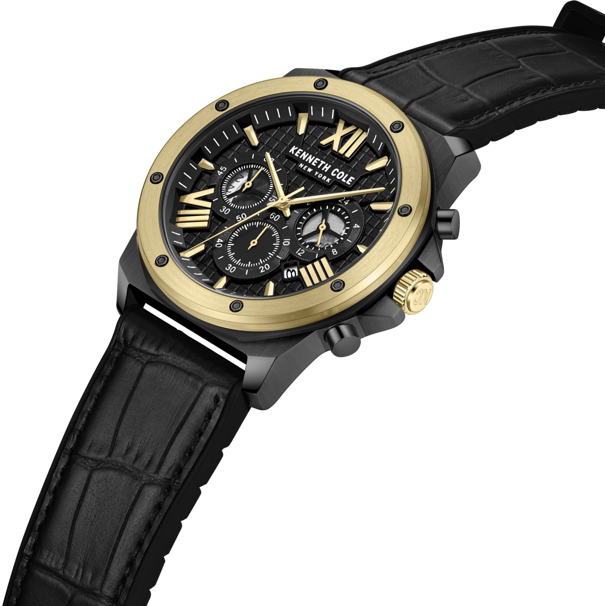 Мужские кварцевые часы-хронографХронографФункция позволяет измерять отрезки времени с особой точностью: часы, минуты, секунды. Верным признаком хронографа является наличие на циферблате 3 дополнительных окошек-счётчиков. с секундомеромСекундомерСекундоме́р — прибор, способный измерять интервалы времени с точностью до долей секунды. Kenneth Cole New York KCWGO0016003, кварцевый механизм с высокой точностью. Класс водозащиты: 30 метров, позволит защитить корпус от случайных брызг или капель дождя. Корпус часов изготовлен из стали с PVD-покрытиемPVDУльтратонкое покрытие наносится в технике вакуумного напыления, сочетает в себе нитрид титана особой прочности со слоем золота или оксида хрома. Несёт в себе декоративную или защитную функцию.. Кожаный ремешок на стандартной застёжке. БезельБезельВнешний ободок, закрепляющий стекло. В спортивных часах так называется поворотное кольцо с делениями на циферблате, выполняет роль таймера – замеряет отрезки времени на шкале. Неподвижный безель – элемент декора. Однонаправленно вращающийся безель на дайверских часах позволяет фиксировать моменты погружения и выныривания на поверхность. с PVD-покрытиемPVDУльтратонкое покрытие наносится в технике вакуумного напыления, сочетает в себе нитрид титана особой прочности со слоем золота или оксида хрома. Несёт в себе декоративную или защитную функцию.. Окошко даты находится в положении между 4 и 5 часов.
