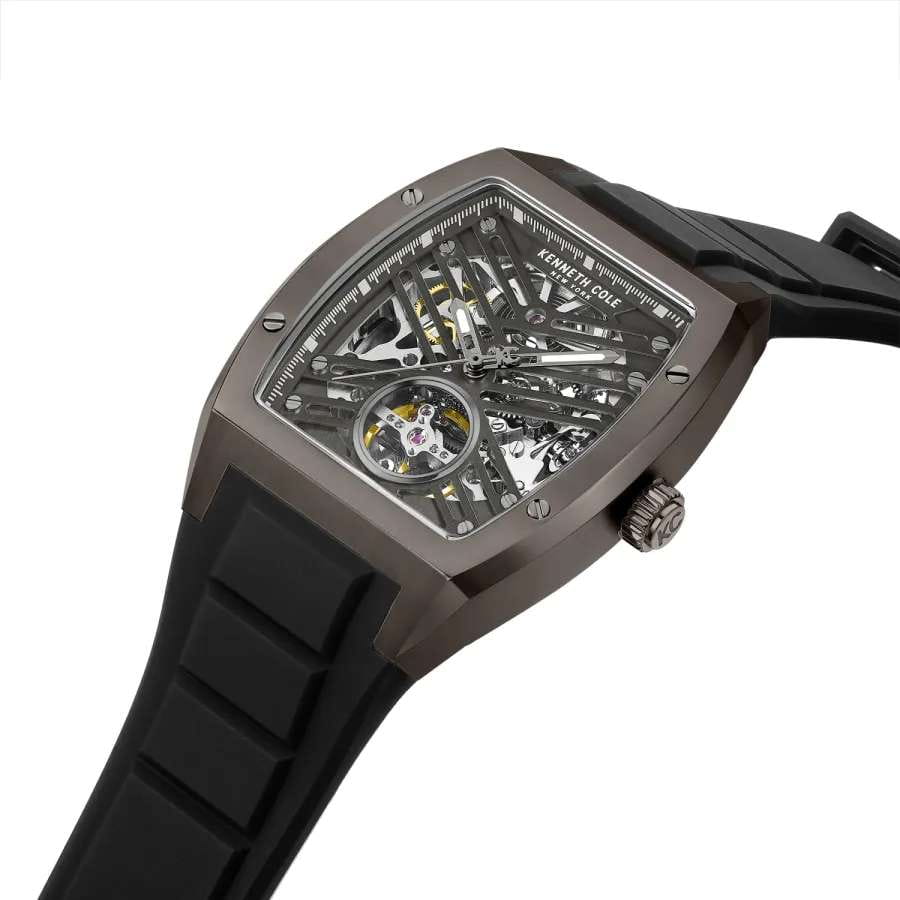 Kenneth Cole KCWGZ0077302 — мужская автоматическая модель с выразительным современным стилем и скелетонизированным дизайном. Корпус выполнен из нержавеющей стали с PVD-покрытиемPVDУльтратонкое покрытие наносится в технике вакуумного напыления, сочетает в себе нитрид титана особой прочности со слоем золота или оксида хрома. Несёт в себе декоративную или защитную функцию. и подчёркивает архитектурный облик часов. Циферблат с открытым механизмом позволяет рассмотреть работу автоматического калибра, акцентируя внимание на его деталях. Метки и стрелки покрыты люминесцентным покрытиемЛюминесцентное покрытиеПозволяет считывать показания времени в темноте. Производители наносят на стрелки, часовые индексы, безель или поверхность циферблата светонакопительный состав, дающий холодное свечение., что обеспечивает читаемость в условиях слабого освещения. Защитную функцию выполняет минеральное стеклоМинеральное стеклоМинеральное стекло представляет собой искусственно выращенный минерал кварца. Такое стекло отличается особой устойчивостью к повреждениям и царапинам. Уступает по некоторым качествам сапфировому стеклу., устойчивое к повседневным повреждениям. Часы дополнены силиконовым ремешком с классической застёжкой, создающим удобную посадку и комфорт в носке. Модель объединяет техническую эстетику скелетона и современный характер, подчёркивая индивидуальность владельца.