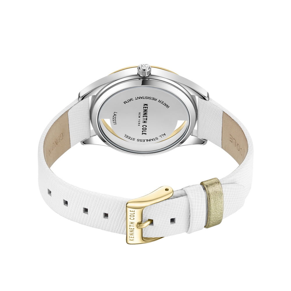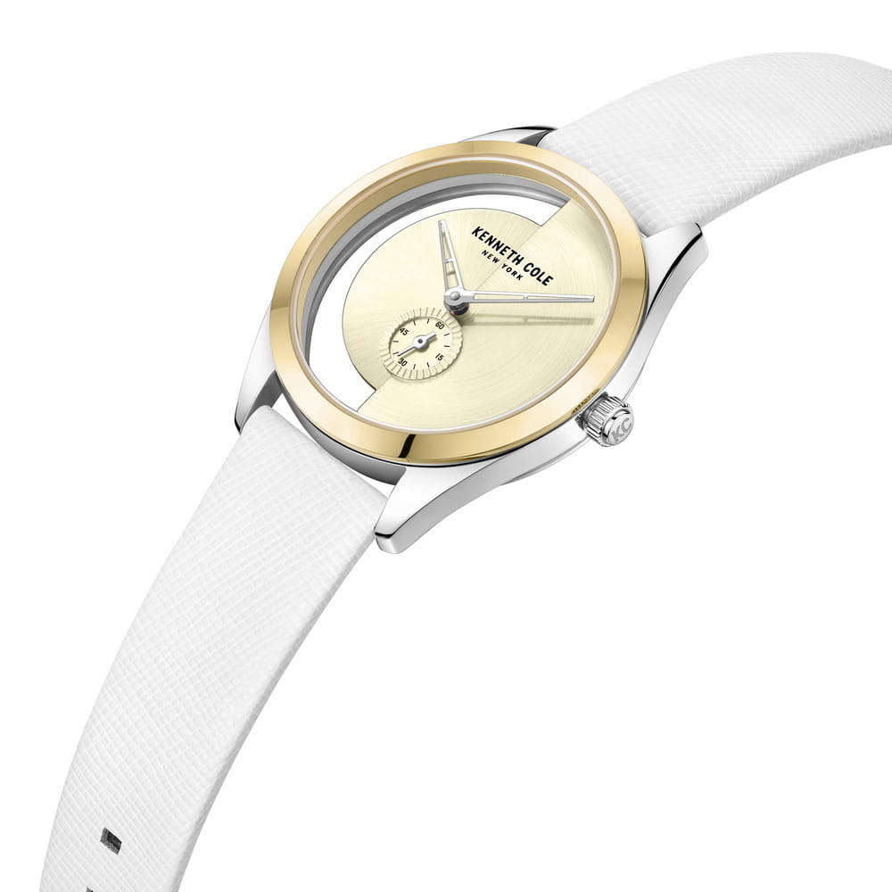 Женские кварцевые часы Kenneth Cole KCWLA2223108 — это стильный и необычный аксессуар с современным дизайном. Корпус диаметром 36 мм выполнен из нержавеющей стали. Безель с IP-покрытиемIP-покрытиеМетод ионного напыления. Демонстрирует повышенную устойчивость к истиранию, окислению и химическим веществам. Под воздействием высокого давления и температуры около 1500°C молекулы металла надёжно соединяются с частицами корпуса часов.. Циферблат золотистого цвета дополнен малой секундной стрелкой, что придаёт классическому дизайну изысканности. Циферблат защищён минеральным стекломМинеральное стеклоМинеральное стекло представляет собой искусственно выращенный минерал кварца. Такое стекло отличается особой устойчивостью к повреждениям и царапинам. Уступает по некоторым качествам сапфировому стеклу.. Особенностью модели является прозрачный корпус, добавляющий оригинальности и визуальной лёгкости. Часы оснащены ремешком из натуральной кожи белого цвета с классической пряжкой. Водонепроницаемость 30 м позволяет использовать часы в повседневных условиях, защищая от случайных брызг и капель дождя. Уникальный внешний вид и внимание к деталям делают эти часы идеальным выбором для тех, кто ценит индивидуальность.