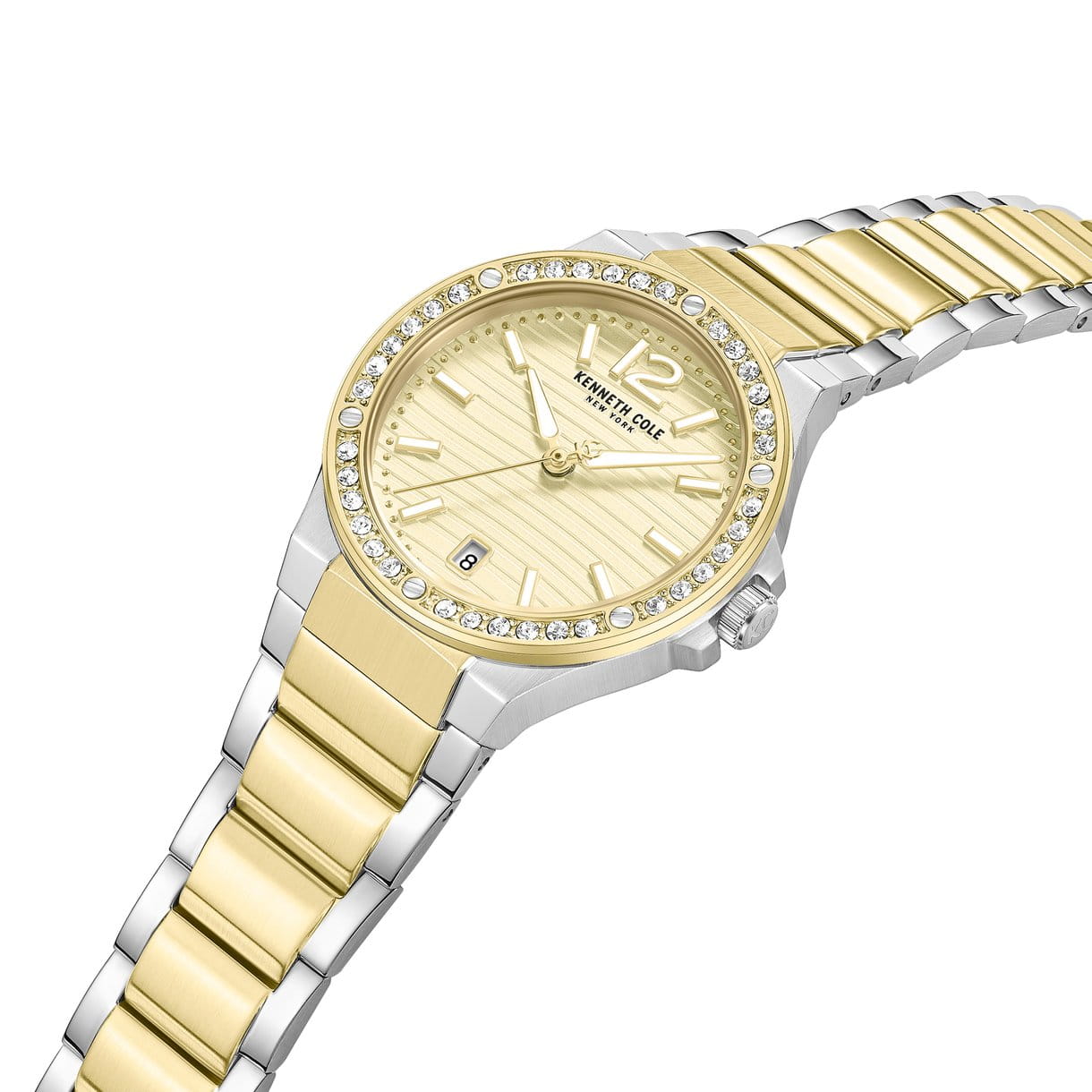 Женские кварцевые часы Kenneth Cole — это элегантный и выразительный аксессуар. Корпус диаметром 32 мм выполнен из нержавеющей стали 316L. Циферблат синего цвета оформлен штрихами, арабской цифрой 12 и украшен цирконами. БезельБезельВнешний ободок, закрепляющий стекло. В спортивных часах так называется поворотное кольцо с делениями на циферблате, выполняет роль таймера – замеряет отрезки времени на шкале. Неподвижный безель – элемент декора. Однонаправленно вращающийся безель на дайверских часах позволяет фиксировать моменты погружения и выныривания на поверхность. с IP-покрытиемIP-покрытиеМетод ионного напыления. Демонстрирует повышенную устойчивость к истиранию, окислению и химическим веществам. Под воздействием высокого давления и температуры около 1500°C молекулы металла надёжно соединяются с частицами корпуса часов. инкрустирован кристаллами. Окошко даты расположено в положении 6 часов. Циферблат защищён минеральным стекломМинеральное стеклоМинеральное стекло представляет собой искусственно выращенный минерал кварца. Такое стекло отличается особой устойчивостью к повреждениям и царапинам. Уступает по некоторым качествам сапфировому стеклу. с антибликовым покрытиемАнтибликовое покрытиеСлой оксида металла в 0,13-0,3 микрон, благодаря которому стекло часов не бликует и не отражает свет. Антибликовое покрытие уменьшает отражение света в 10 раз, обеспечивая отличную читаемость показателей циферблата.. Механизм — кварцевый калибр TMI VX32. Часы оснащены стальным браслетом с частичным IP-покрытиемIP-покрытиеМетод ионного напыления. Демонстрирует повышенную устойчивость к истиранию, окислению и химическим веществам. Под воздействием высокого давления и температуры около 1500°C молекулы металла надёжно соединяются с частицами корпуса часов. на раскладной застёжкеРаскладная застёжкаТакой тип застёжки используется только на браслетах из металла. Она никогда не раскрывается полностью, происходит разделение на 2 и более частей. Раскладывающая застёжка снизит вероятность потери часов к минимуму.. Водонепроницаемость 30 м позволяет использовать часы в повседневных условиях. Идеальный выбор для тех, кто ценит стиль, блеск и американское качество.