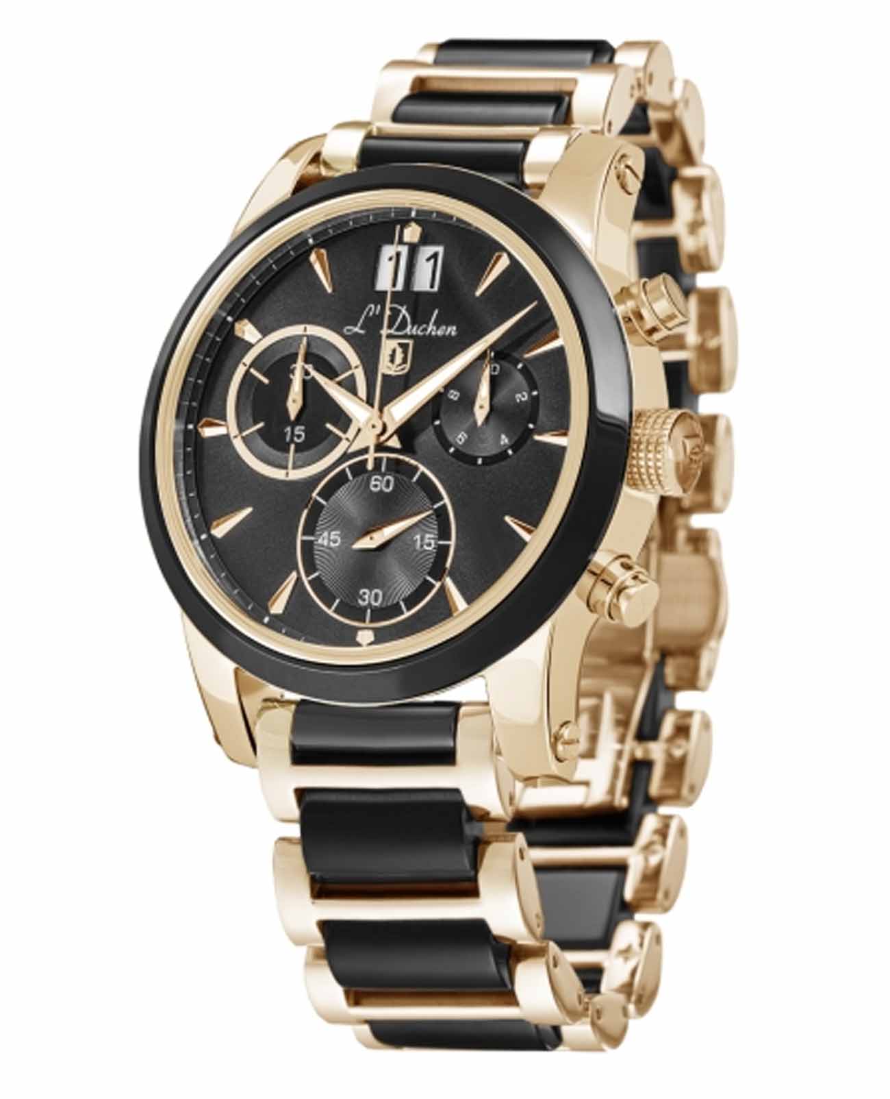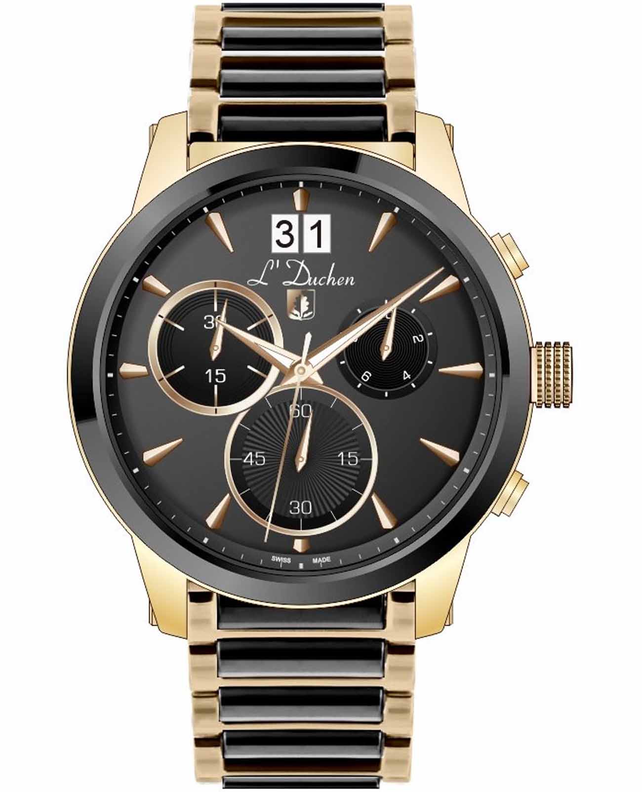 Мужские швейцарские часы-хронографХронографФункция позволяет измерять отрезки времени с особой точностью: часы, минуты, секунды. Верным признаком хронографа является наличие на циферблате 3 дополнительных окошек-счётчиков. L'Duchen Aerostat Chrono D 232.20.31,кварцевый механизм с высокой точностью. Сапфировое стеклоСапфировое стеклоПрочный и надёжный материал из кристалла сапфира синтетического происхождения, характеризующийся особой твёрдостью и устойчивостью к царапинам и повреждениям. устойчивое к появлению царапин, обладающее высокой прозрачностью. Корпус часов выполнен из нержавеющей стали с PVD-покрытиемPVDУльтратонкое покрытие наносится в технике вакуумного напыления, сочетает в себе нитрид титана особой прочности со слоем золота или оксида хрома. Несёт в себе декоративную или защитную функцию.. БезельБезельВнешний ободок, закрепляющий стекло. В спортивных часах так называется поворотное кольцо с делениями на циферблате, выполняет роль таймера – замеряет отрезки времени на шкале. Неподвижный безель – элемент декора. Однонаправленно вращающийся безель на дайверских часах позволяет фиксировать моменты погружения и выныривания на поверхность. из керамики. Стрелки с люминесцентным покрытиемЛюминесцентное покрытиеПозволяет считывать показания времени в темноте. Производители наносят на стрелки, часовые индексы, безель или поверхность циферблата светонакопительный состав, дающий холодное свечение.. Класс водозащиты: 100 метров, позволит плавать, нырять и заниматься другими водными видами спорта. Стальной браслет с PVD-покрытиемPVDУльтратонкое покрытие наносится в технике вакуумного напыления, сочетает в себе нитрид титана особой прочности со слоем золота или оксида хрома. Несёт в себе декоративную или защитную функцию. и керамическими вставками на застёжке «бабочка» с кнопкамиЗастёжка "бабочка"Такой вид застёжки дополняется предохранителями, помогающими избежать случайного раскрытия браслета. Обладают изящным исполнением. .
