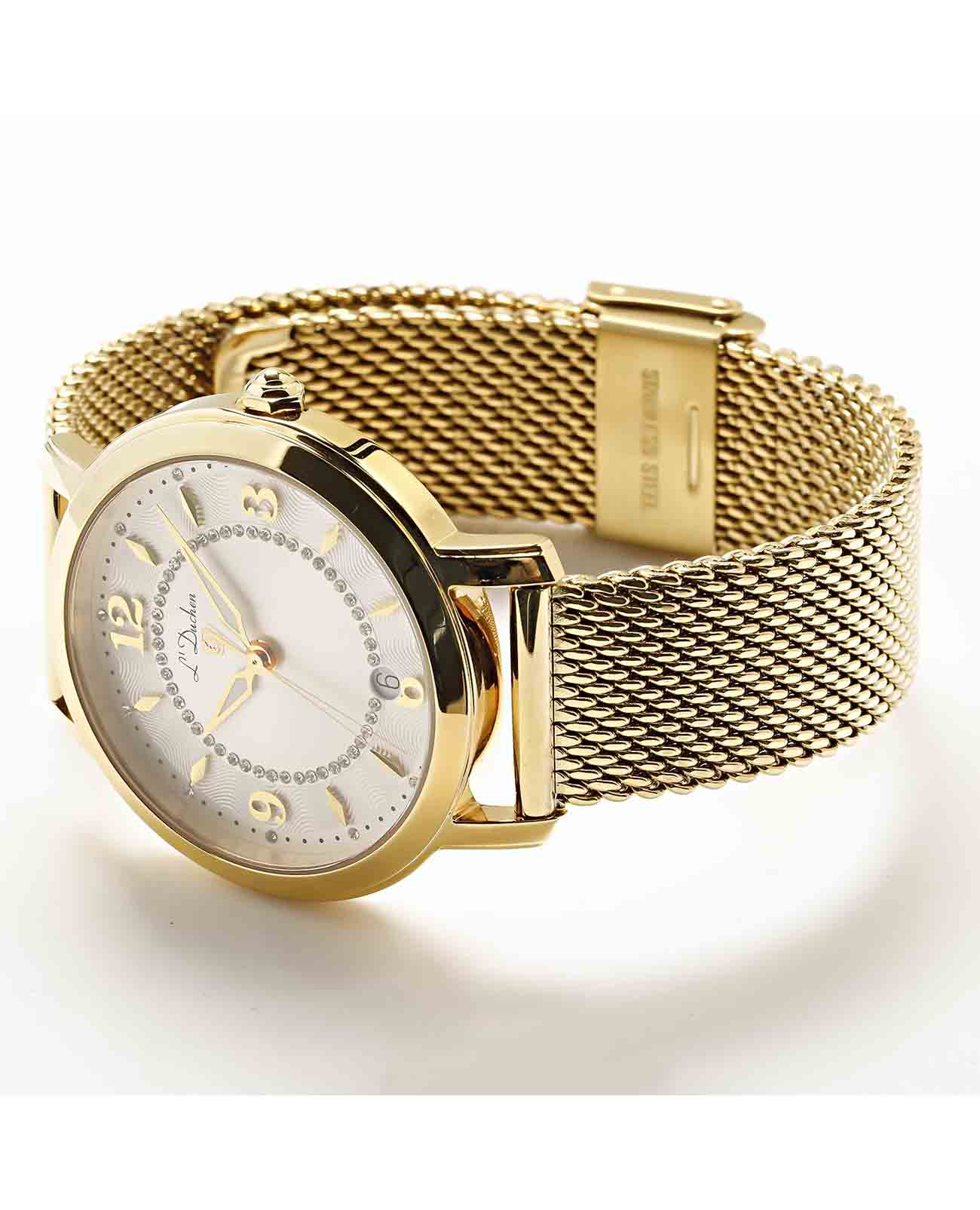Женские швейцарские L'Duchen Sonata D 281.26.33 M, кварцевый механизм с высокой точностью. Сапфировое стеклоСапфировое стеклоПрочный и надёжный материал из кристалла сапфира синтетического происхождения, характеризующийся особой твёрдостью и устойчивостью к царапинам и повреждениям. устойчивое к появлению царапин, обладающее высокой прозрачностью. Корпус часов выполнен из нержавеющей стали с PVD-покрытиемPVDУльтратонкое покрытие наносится в технике вакуумного напыления, сочетает в себе нитрид титана особой прочности со слоем золота или оксида хрома. Несёт в себе декоративную или защитную функцию.. Стрелки с люминесцентным покрытиемЛюминесцентное покрытиеПозволяет считывать показания времени в темноте. Производители наносят на стрелки, часовые индексы, безель или поверхность циферблата светонакопительный состав, дающий холодное свечение.. Класс водозащиты: 30 метров, позволит защитить корпус от случайных брызг или капель дождя. Стальной браслет миланского плетения на раскладном замкеРаскладной замокДанный вариант застежки используется только на часах с металлическим браслетом. Отличительная особенность такого крепления в том, что длина браслета становится универсальной и вы можете самостоятельно отрегулировать нужный вам размер – застежка просто двигается по браслету часов..