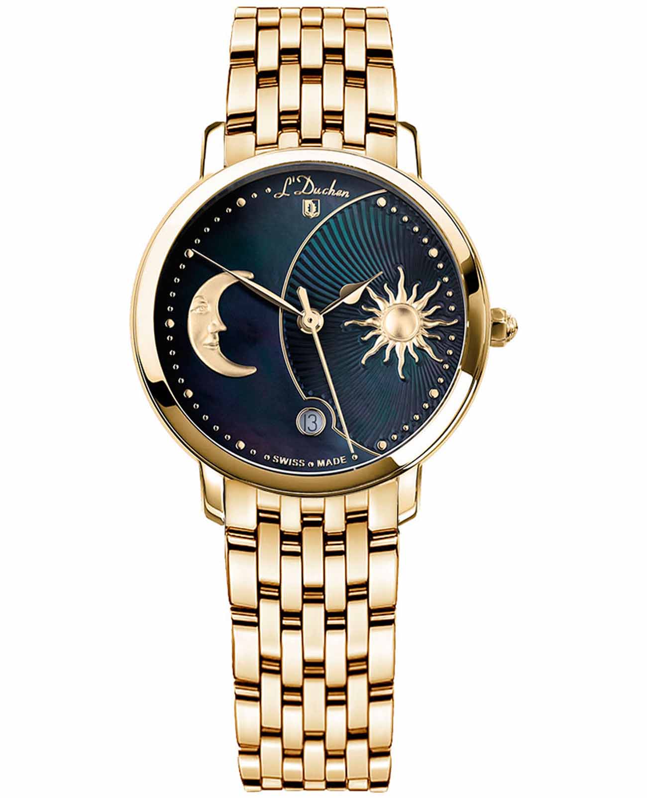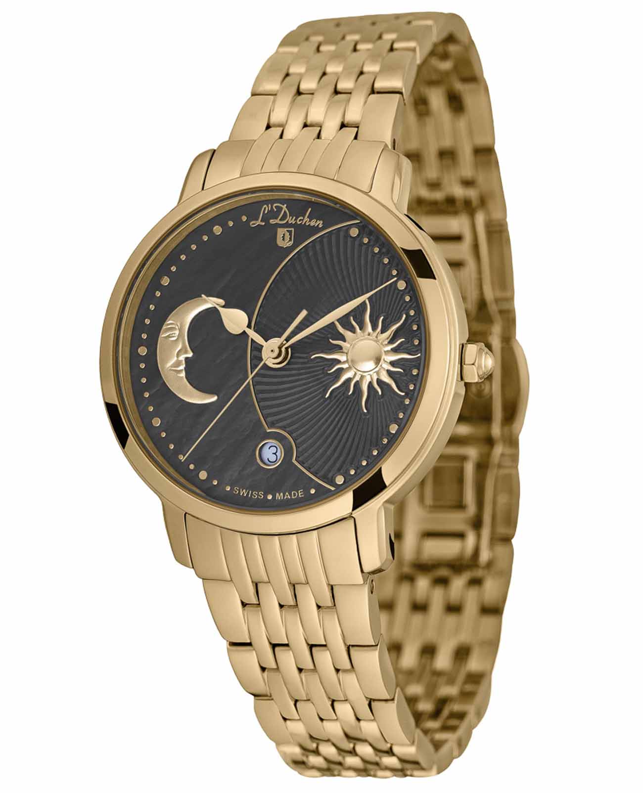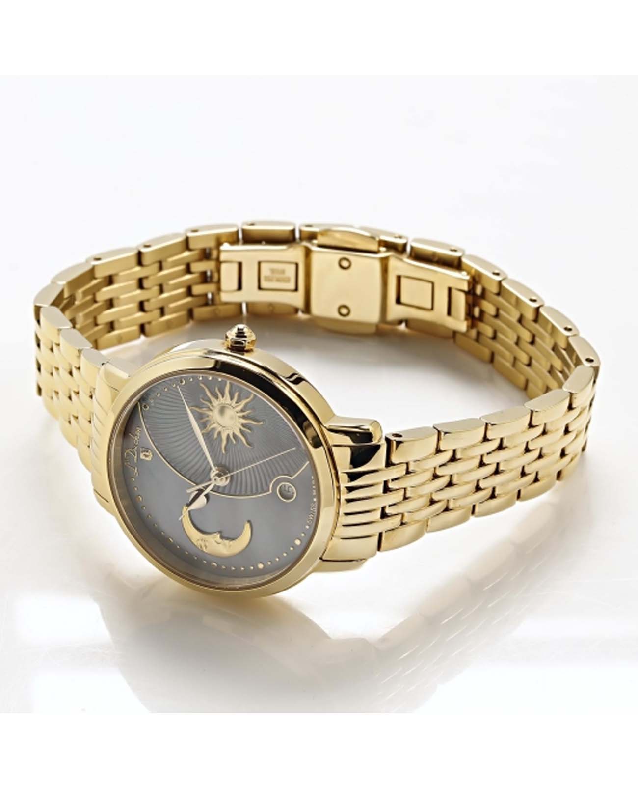 Женские швейцарские часы L'Duchen Day & Night D 781.20.31, кварцевый механизм с высокой точностью. Сапфировое стеклоСапфировое стеклоПрочный и надёжный материал из кристалла сапфира синтетического происхождения, характеризующийся особой твёрдостью и устойчивостью к царапинам и повреждениям. устойчивое к появлению царапин, обладающее высокой прозрачностью. Корпус часов выполнен из нержавеющей стали с PVD-покрытиемPVDУльтратонкое покрытие наносится в технике вакуумного напыления, сочетает в себе нитрид титана особой прочности со слоем золота или оксида хрома. Несёт в себе декоративную или защитную функцию.. Окошко даты находится в положении 6 часов. Класс водозащиты: 50 метров, позволит защитить корпус от случайных брызг или капель дождя. Стальной браслет с PVD-покрытиемPVDУльтратонкое покрытие наносится в технике вакуумного напыления, сочетает в себе нитрид титана особой прочности со слоем золота или оксида хрома. Несёт в себе декоративную или защитную функцию. на застёжке «бабочка» с кнопкамиЗастёжка "бабочка"Такой вид застёжки дополняется предохранителями, помогающими избежать случайного раскрытия браслета. Обладают изящным исполнением. .