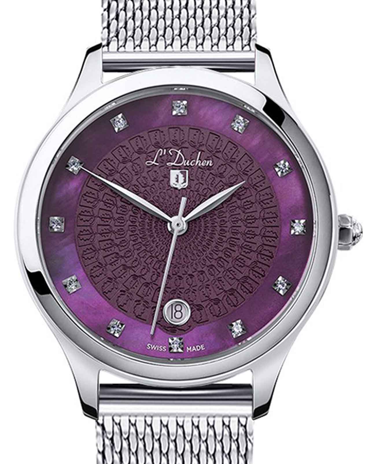 Женские швейцарские часы L'Duchen Grace D 791.19.30 M, кварцевый механизм с высокой точностью. Сапфировое стеклоСапфировое стеклоПрочный и надёжный материал из кристалла сапфира синтетического происхождения, характеризующийся особой твёрдостью и устойчивостью к царапинам и повреждениям. устойчивое к появлению царапин, обладающее высокой прозрачностью. Корпус часов выполнен из нержавеющей стали. Окошко даты находится в положении 6 часов. Класс водозащиты: 50 метров, позволит защитить корпус от случайных брызг или капель дождя. Стальной браслет миланского плетения на раскладном замкеРаскладной замокДанный вариант застежки используется только на часах с металлическим браслетом. Отличительная особенность такого крепления в том, что длина браслета становится универсальной и вы можете самостоятельно отрегулировать нужный вам размер – застежка просто двигается по браслету часов..