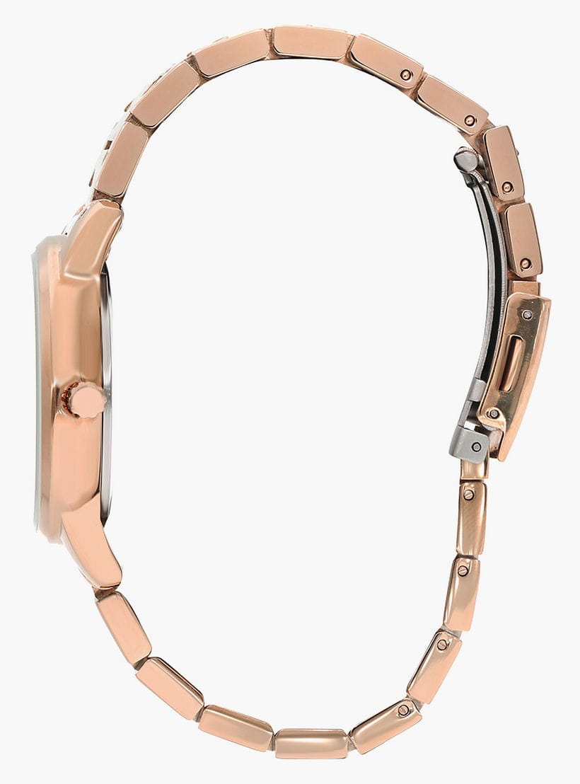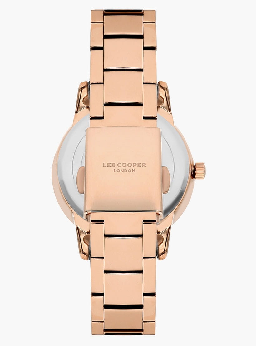 Женские часы Lee Cooper LC07229.410 — это стильное сочетание элегантности и современного дизайна. Круглый корпус диаметром 34 мм выполнен из металла с IP-покрытиемIP-покрытиеМетод ионного напыления. Демонстрирует повышенную устойчивость к истиранию, окислению и химическим веществам. Под воздействием высокого давления и температуры около 1500°C молекулы металла надёжно соединяются с частицами корпуса часов. в розово-золотом оттенке, а безельБезельВнешний ободок, закрепляющий стекло. В спортивных часах так называется поворотное кольцо с делениями на циферблате, выполняет роль таймера – замеряет отрезки времени на шкале. Неподвижный безель – элемент декора. Однонаправленно вращающийся безель на дайверских часах позволяет фиксировать моменты погружения и выныривания на поверхность. украшен кристаллами, придающими модели особый блеск. Серебристый циферблат защищен минеральным стекломМинеральное стеклоМинеральное стекло представляет собой искусственно выращенный минерал кварца. Такое стекло отличается особой устойчивостью к повреждениям и царапинам. Уступает по некоторым качествам сапфировому стеклу., обеспечивающим устойчивость к царапинам. Часы оснащены надежным кварцевым механизмом, а металлический браслет с раскладной застёжкойРаскладная застёжкаТакой тип застёжки используется только на браслетах из металла. Она никогда не раскрывается полностью, происходит разделение на 2 и более частей. Раскладывающая застёжка снизит вероятность потери часов к минимуму. гарантирует комфортную посадку на запястье. Водозащита 30 метров защищает модель от случайных брызг и дождя. Lee Cooper LC07229.410 — отличный выбор для тех, кто ценит утонченность и качество.