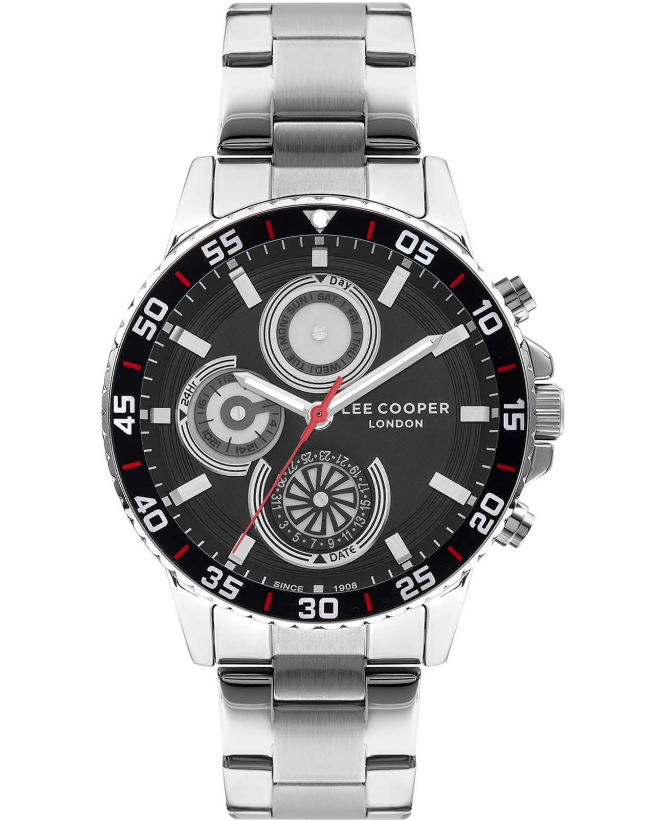 Мужские наручные часы Lee Cooper LC07636.350 оснащены кварцевым механизмом, обеспечивающий высокую точность хода и надежность. Корпус часов выполнен из суперметалла серебристого цвета, что делает их устойчивыми к внешним воздействиям и придает благородный вид. Элегантный безельБезельВнешний ободок, закрепляющий стекло. В спортивных часах так называется поворотное кольцо с делениями на циферблате, выполняет роль таймера – замеряет отрезки времени на шкале. Неподвижный безель – элемент декора. Однонаправленно вращающийся безель на дайверских часах позволяет фиксировать моменты погружения и выныривания на поверхность. с IP-покрытиемIP-покрытиеМетод ионного напыления. Демонстрирует повышенную устойчивость к истиранию, окислению и химическим веществам. Под воздействием высокого давления и температуры около 1500°C молекулы металла надёжно соединяются с частицами корпуса часов.. Циферблат черного цвета украшен классическими стрелками с люминесцентным покрытиемЛюминесцентное покрытиеПозволяет считывать показания времени в темноте. Производители наносят на стрелки, часовые индексы, безель или поверхность циферблата светонакопительный состав, дающий холодное свечение., гармонично дополняющим общий дизайн модели. Для защиты циферблата используется минеральное стеклоМинеральное стеклоМинеральное стекло представляет собой искусственно выращенный минерал кварца. Такое стекло отличается особой устойчивостью к повреждениям и царапинам. Уступает по некоторым качествам сапфировому стеклу., устойчивое к царапинам и механическим повреждениям. Корпус имеет круглую форму диаметром 45 мм, что делает часы заметными и подходящими. Браслет из стали оснащен раскладной застёжкойРаскладная застёжкаТакой тип застёжки используется только на браслетах из металла. Она никогда не раскрывается полностью, происходит разделение на 2 и более частей. Раскладывающая застёжка снизит вероятность потери часов к минимуму., обеспечивающим комфортное и безопасное ношение. Вынесенный циферблат с 24-х часовым указателем времени, индикацией даты и дня недели. Часы обладают водонепроницаемостью до 50 метров (5 АТМ), что позволяет использовать их в повседневной жизни, включая контакт с водой при мытье рук или дожде. Эти часы станут идеальным выбором для мужчин, ценящих стиль, качество и функциональность.