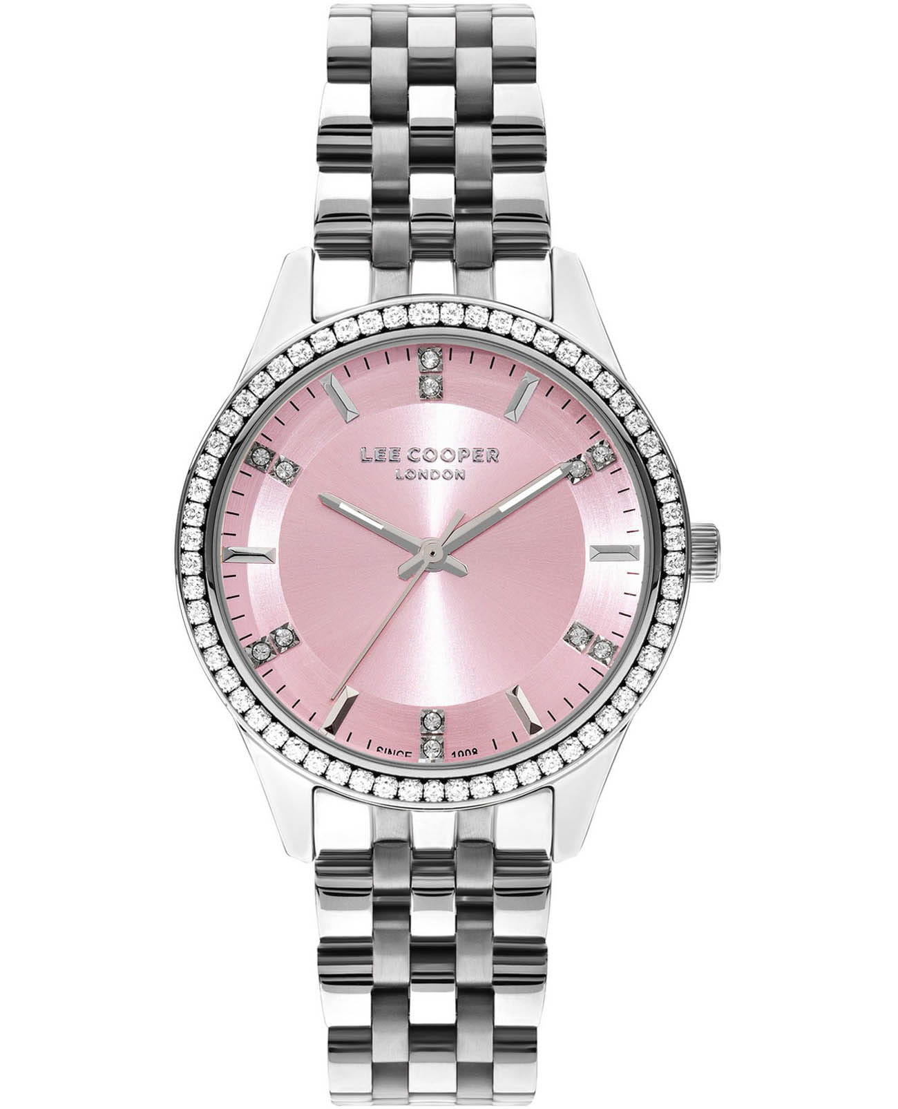 Женские часы Lee Cooper LC07826.380 выполнены в классическом стиле и сочетают строгий дизайн с надёжным механизмом. Модель оснащена кварцевым механизмом, обеспечивающим точность хода и минимальное обслуживание. Корпус круглой формы имеет размер 35 мм, изготовлен из суперметалла с изысканным неподвижным безелемБезельВнешний ободок, закрепляющий стекло. В спортивных часах так называется поворотное кольцо с делениями на циферблате, выполняет роль таймера – замеряет отрезки времени на шкале. Неподвижный безель – элемент декора. Однонаправленно вращающийся безель на дайверских часах позволяет фиксировать моменты погружения и выныривания на поверхность. с вставками из циркона, гарантирует комфорт при ношении. Циферблат дополнен изящными вставками из циркона для чёткого отсчёта времени. Защиту циферблата обеспечивает минеральное стеклоМинеральное стеклоМинеральное стекло представляет собой искусственно выращенный минерал кварца. Такое стекло отличается особой устойчивостью к повреждениям и царапинам. Уступает по некоторым качествам сапфировому стеклу., устойчивое к мелким механическим повреждениям. Стрелки с люминесцентным покрытиемЛюминесцентное покрытиеПозволяет считывать показания времени в темноте. Производители наносят на стрелки, часовые индексы, безель или поверхность циферблата светонакопительный состав, дающий холодное свечение.. Стальной браслет на раскладной застёжкеРаскладная застёжкаТакой тип застёжки используется только на браслетах из металла. Она никогда не раскрывается полностью, происходит разделение на 2 и более частей. Раскладывающая застёжка снизит вероятность потери часов к минимуму. гарантирует удобную посадку и надёжную фиксацию на запястье. Водозащита 30WR позволяет использовать часы в повседневных условиях без риска повреждения от случайных брызг воды. Это сочетание классического дизайна, прочности материалов и качества исполнения для уверенных в себе женщин.