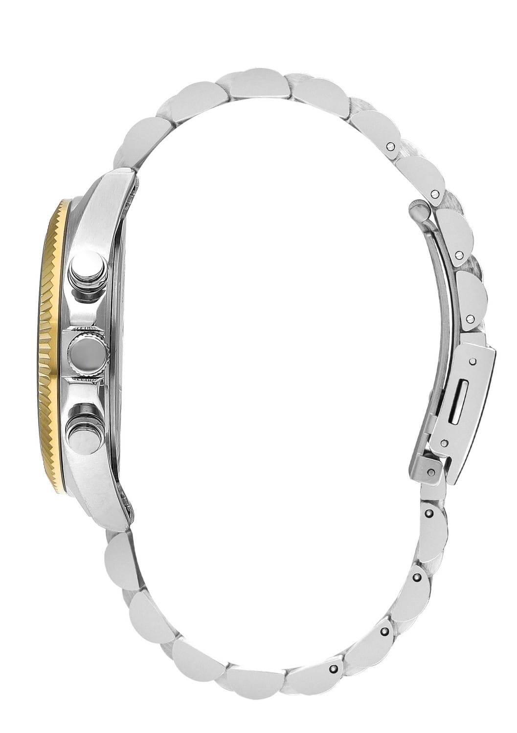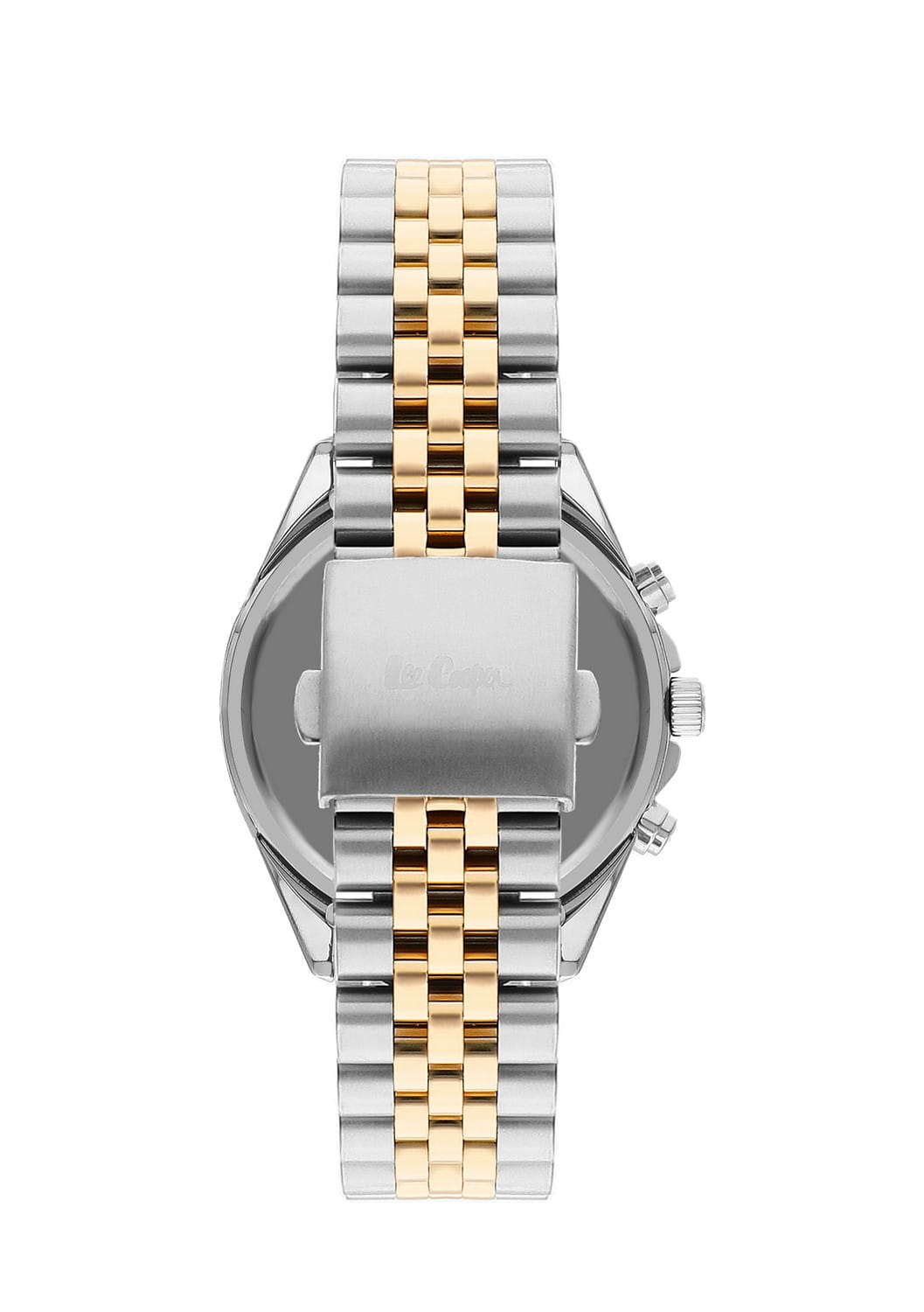 Мужские часы Lee Cooper LC07838.270 — это стильное сочетание элегантности и современного дизайна. Корпус диаметром 45 мм выполнен из суперметалла серебристого цвета с неподвижным безелемБезельВнешний ободок, закрепляющий стекло. В спортивных часах так называется поворотное кольцо с делениями на циферблате, выполняет роль таймера – замеряет отрезки времени на шкале. Неподвижный безель – элемент декора. Однонаправленно вращающийся безель на дайверских часах позволяет фиксировать моменты погружения и выныривания на поверхность. с IP-покрытиемIP-покрытиеМетод ионного напыления. Демонстрирует повышенную устойчивость к истиранию, окислению и химическим веществам. Под воздействием высокого давления и температуры около 1500°C молекулы металла надёжно соединяются с частицами корпуса часов., придающий модели особый блеск. Изысканный циферблат защищен минеральным стекломМинеральное стеклоМинеральное стекло представляет собой искусственно выращенный минерал кварца. Такое стекло отличается особой устойчивостью к повреждениям и царапинам. Уступает по некоторым качествам сапфировому стеклу., обеспечивающим устойчивость к царапинам. Метки в виде штрихов. Вынесенный циферблат с 24-х часовым указателем времени и c хронографомХронографФункция позволяет измерять отрезки времени с особой точностью: часы, минуты, секунды. Верным признаком хронографа является наличие на циферблате 3 дополнительных окошек-счётчиков.. Стрелки и метки с люминесцентным покрытиемЛюминесцентное покрытиеПозволяет считывать показания времени в темноте. Производители наносят на стрелки, часовые индексы, безель или поверхность циферблата светонакопительный состав, дающий холодное свечение. позволяют легко считывать время даже в условиях недостаточного освещения.Часы оснащены надежным кварцевым механизмом, а стальной браслет с частичным IP-покрытиемIP-покрытиеМетод ионного напыления. Демонстрирует повышенную устойчивость к истиранию, окислению и химическим веществам. Под воздействием высокого давления и температуры около 1500°C молекулы металла надёжно соединяются с частицами корпуса часов. на раскладной застёжкеРаскладная застёжкаТакой тип застёжки используется только на браслетах из металла. Она никогда не раскрывается полностью, происходит разделение на 2 и более частей. Раскладывающая застёжка снизит вероятность потери часов к минимуму. гарантирует комфортную посадку на запястье. Водозащита 50 метров защищает модель от случайных брызг и дождя. Lee Cooper  — отличный выбор для тех, кто ценит утонченность и качество.
