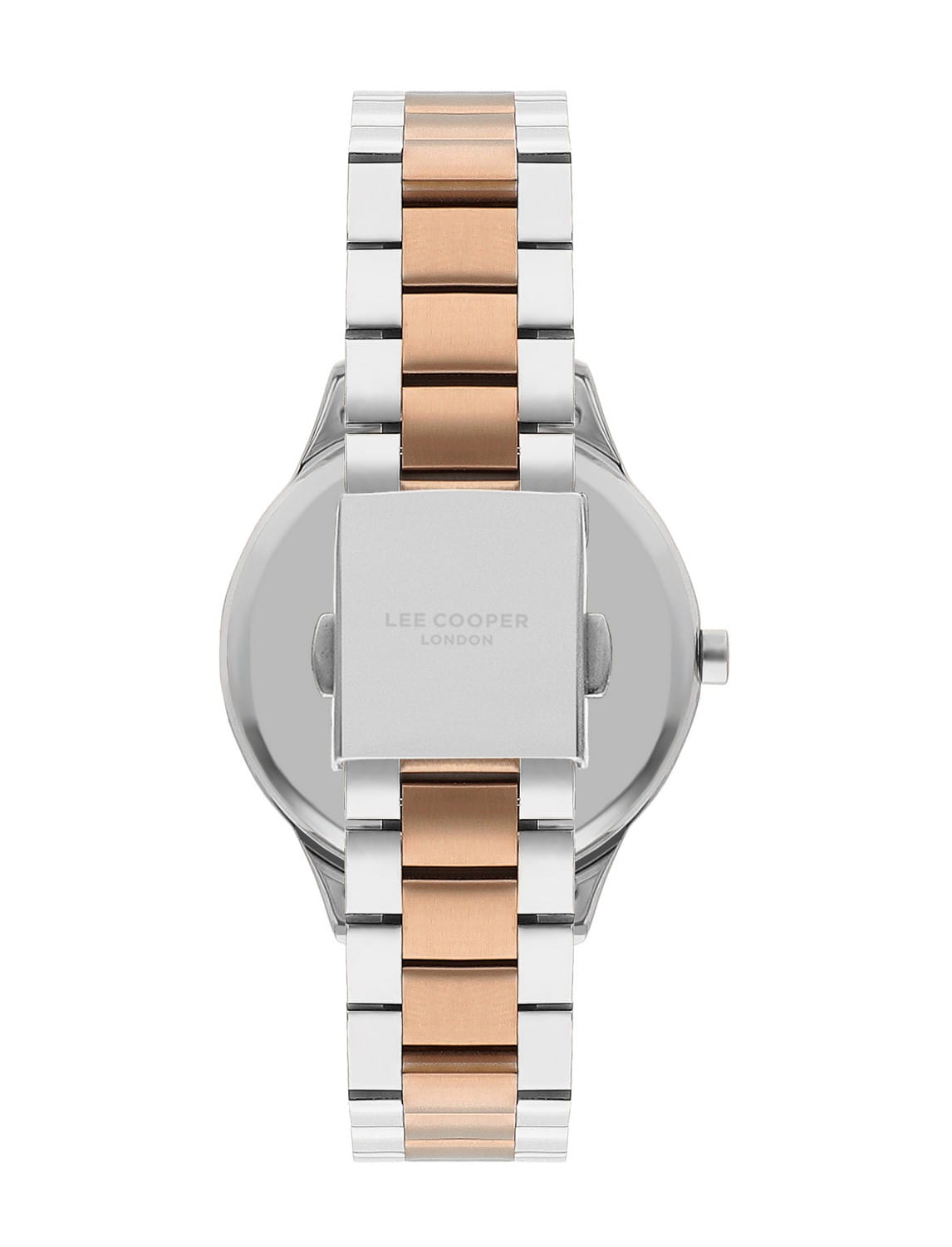 Женские часы Lee Cooper LC07865.530 — это стильное сочетание элегантности и современного дизайна. Круглый корпус диаметром 38 мм выполнен из суперметалла с  безелемБезельВнешний ободок, закрепляющий стекло. В спортивных часах так называется поворотное кольцо с делениями на циферблате, выполняет роль таймера – замеряет отрезки времени на шкале. Неподвижный безель – элемент декора. Однонаправленно вращающийся безель на дайверских часах позволяет фиксировать моменты погружения и выныривания на поверхность. с IP-покрытиемIP-покрытиеМетод ионного напыления. Демонстрирует повышенную устойчивость к истиранию, окислению и химическим веществам. Под воздействием высокого давления и температуры около 1500°C молекулы металла надёжно соединяются с частицами корпуса часов.  цвета розового золота, придающий модели особый блеск. Серебристый циферблат защищен минеральным стекломМинеральное стеклоМинеральное стекло представляет собой искусственно выращенный минерал кварца. Такое стекло отличается особой устойчивостью к повреждениям и царапинам. Уступает по некоторым качествам сапфировому стеклу., обеспечивающим устойчивость к царапинам. Часы оснащены надежным кварцевым механизмом, а стальной браслет с частичным IP-покрытиемIP-покрытиеМетод ионного напыления. Демонстрирует повышенную устойчивость к истиранию, окислению и химическим веществам. Под воздействием высокого давления и температуры около 1500°C молекулы металла надёжно соединяются с частицами корпуса часов. на раскладной застёжкеРаскладная застёжкаТакой тип застёжки используется только на браслетах из металла. Она никогда не раскрывается полностью, происходит разделение на 2 и более частей. Раскладывающая застёжка снизит вероятность потери часов к минимуму. гарантирует комфортную посадку на запястье. Мультифункциональная модель с индикацией даты, дня недели, с дополнительным 24-х часовым индикатором. Водозащита 30 метров защищает модель от случайных брызг и дождя. Lee Cooper  — отличный выбор для тех, кто ценит утонченность и качество.