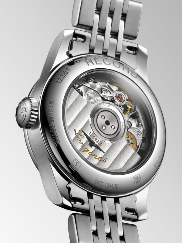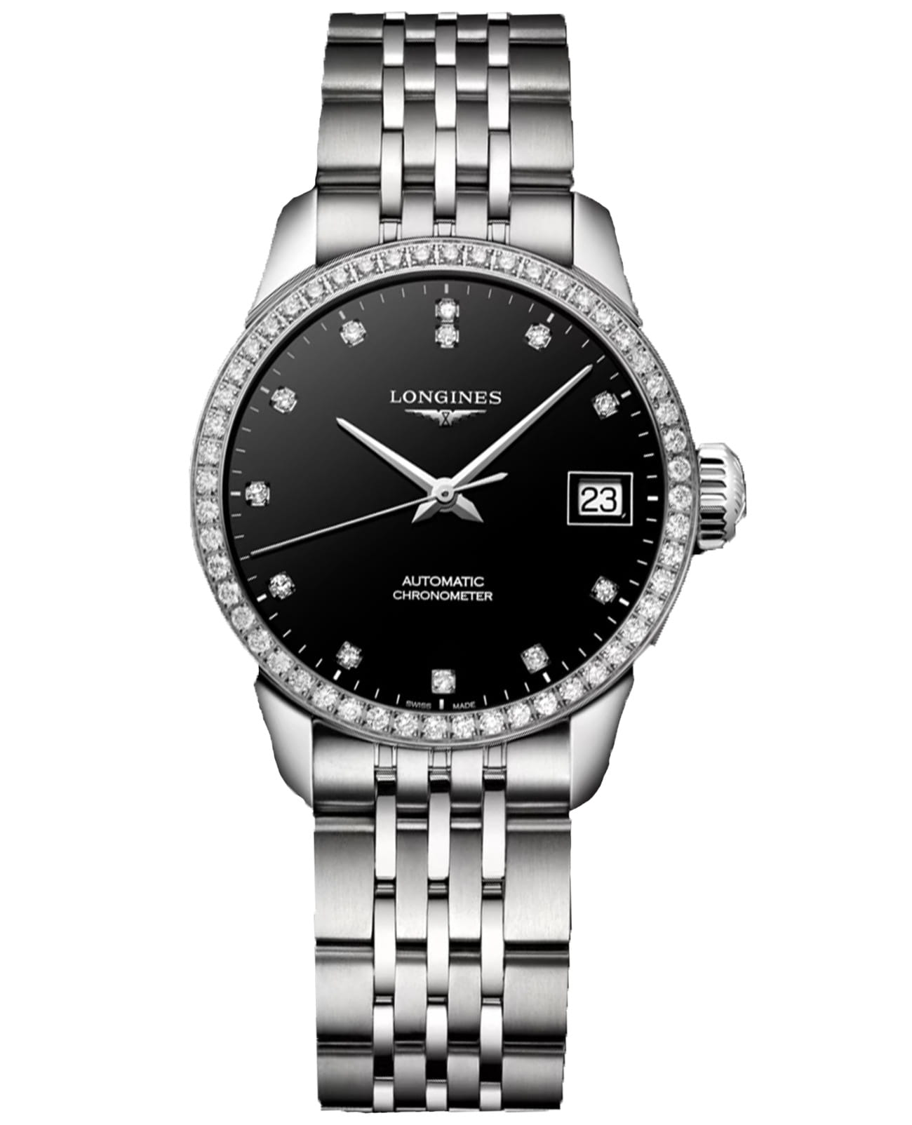 Женские механические швейцарские часы с бриллиантами Longines Record Collection L2.320.0.57.6, механический механизм (автоматический калибр) с высокой точностью. Сапфировое стеклоСапфировое стеклоПрочный и надёжный материал из кристалла сапфира синтетического происхождения, характеризующийся особой твёрдостью и устойчивостью к царапинам и повреждениям. устойчивое к появлению царапин, обладающее высокой прозрачностью. БезельБезельВнешний ободок, закрепляющий стекло. В спортивных часах так называется поворотное кольцо с делениями на циферблате, выполняет роль таймера – замеряет отрезки времени на шкале. Неподвижный безель – элемент декора. Однонаправленно вращающийся безель на дайверских часах позволяет фиксировать моменты погружения и выныривания на поверхность. с 52 бриллиантами группы Top Wesselton IF-VVS общим весом 0.405 карата. Прозрачная задняя крышка с сапфировым стекломСапфировое стеклоПрочный и надёжный материал из кристалла сапфира синтетического происхождения, характеризующийся особой твёрдостью и устойчивостью к царапинам и повреждениям.. Посеребренные полированные стрелки и бриллиантовые метки. Циферблат с 12 бриллиантами группы Top Wesselton VS-SI общим весом 0.034 карата. Автоматический механизм с частотой баланса 28 800 полуколебаний в час и монокристаллической кремниевой спиралью баланса, обеспечивающей запас хода около 45 часов. Специальная функция - хронометр c сертификацией COSCСертификат COSCОфициальный сертификат, подтверждающий то, что часы ходят с особо высокой точностью. Для получения документа часы подвергаются тестовым испытаниям, разработанным швейцарским институтом тестирования хронометров COSC. Допустимая норма для механических часов -4/+6 секунд в день, для кварцевых моделей +/- 0,07 секунд в день.. Класс водозащиты: 30 метров, позволит защитить корпус от случайных брызг или капель дождя. Корпус часов изготовлен из стали. Стальной браслет на застёжке-бабочке с кнопкамиЗастёжка "бабочка"Такой вид застёжки дополняется предохранителями, помогающими избежать случайного раскрытия браслета. Обладают изящным исполнением. .