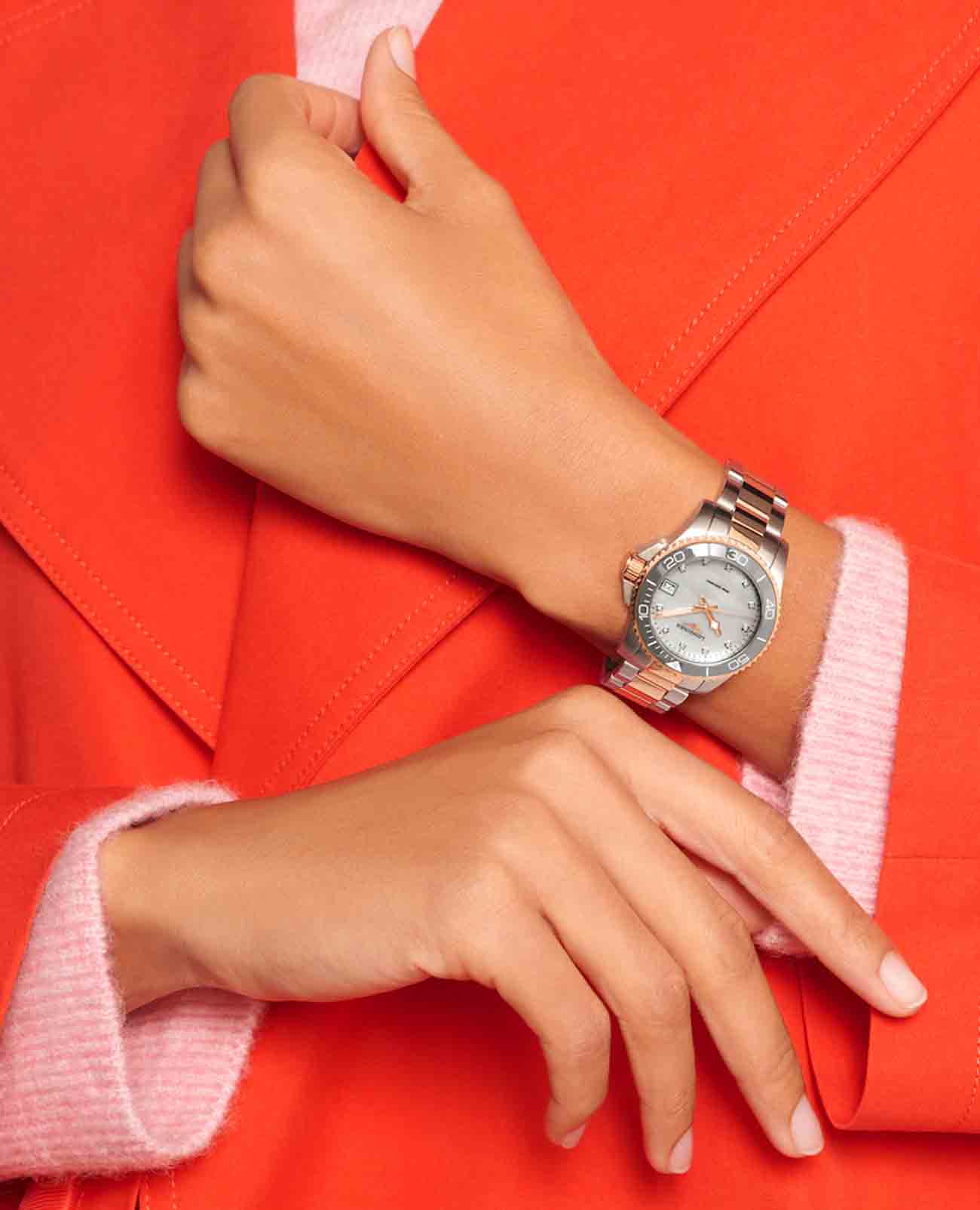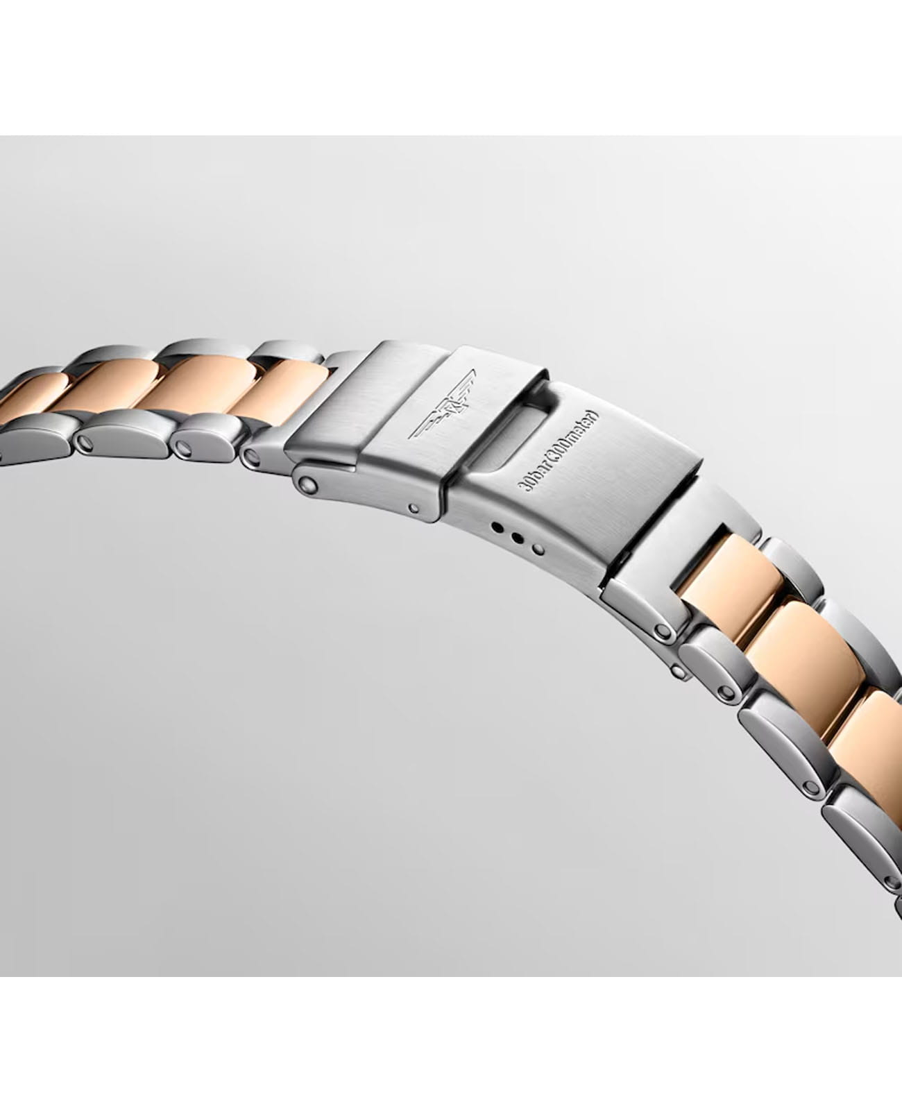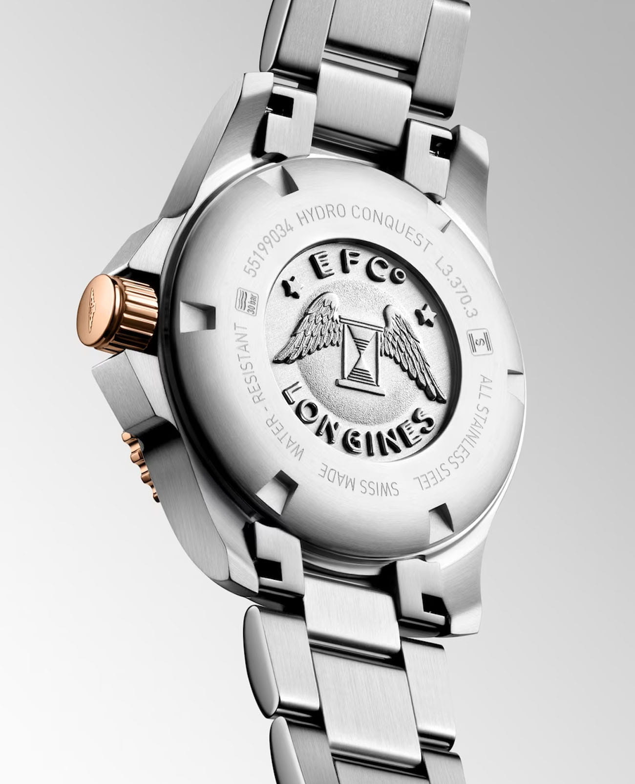 Женские швейцарские часы для дайвинга Longines HydroConquest L3.370.3.89.6, кварцевый механизм с высокой точностью. Сапфировое стеклоСапфировое стеклоПрочный и надёжный материал из кристалла сапфира синтетического происхождения, характеризующийся особой твёрдостью и устойчивостью к царапинам и повреждениям. с многослойным антибликовым покрытием с обеих сторон, устойчивое к появлению царапин, обладающее высокой прозрачностью. Корпус часов изготовлен из стали. Вращающийся безельБезельВнешний ободок, закрепляющий стекло. В спортивных часах так называется поворотное кольцо с делениями на циферблате, выполняет роль таймера – замеряет отрезки времени на шкале. Неподвижный безель – элемент декора. Однонаправленно вращающийся безель на дайверских часах позволяет фиксировать моменты погружения и выныривания на поверхность. из стали с PVD-покрытиемPVDУльтратонкое покрытие наносится в технике вакуумного напыления, сочетает в себе нитрид титана особой прочности со слоем золота или оксида хрома. Несёт в себе декоративную или защитную функцию. и керамики, защищенный от царапин, никогда не изнашивается и не выцветает. Циферблат с 11 бриллиантами группы Top Wesselton VS-SI общим весом 0.044 карата. Стрелки и метки с люминесцентным покрытиемЛюминесцентное покрытиеПозволяет считывать показания времени в темноте. Производители наносят на стрелки, часовые индексы, безель или поверхность циферблата светонакопительный состав, дающий холодное свечение.. Окошко даты находится в положении 3 часов. Класс водозащиты: 300 метров, позволит плавать, нырять и заниматься другими водными видами спорта. Стальной браслет с частичным PVD-покрытиемPVDУльтратонкое покрытие наносится в технике вакуумного напыления, сочетает в себе нитрид титана особой прочности со слоем золота или оксида хрома. Несёт в себе декоративную или защитную функцию. на раскладной застёжкеРаскладная застёжкаТакой тип застёжки используется только на браслетах из металла. Она никогда не раскрывается полностью, происходит разделение на 2 и более частей. Раскладывающая застёжка снизит вероятность потери часов к минимуму..