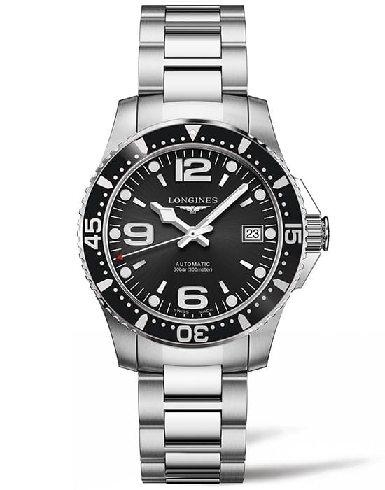 Мужские механические швейцарские часы с автоподзаводом Longines HydroConquest L3.781.3.96.7. Сапфировое стеклоСапфировое стеклоПрочный и надёжный материал из кристалла сапфира синтетического происхождения, характеризующийся особой твёрдостью и устойчивостью к царапинам и повреждениям. с антибликовым покрытием, устойчивое к мелким механическим повреждениям. Корпус часов изготовлен из нержавеющей стали. Вращающийся стальной безельБезельВнешний ободок, закрепляющий стекло. В спортивных часах так называется поворотное кольцо с делениями на циферблате, выполняет роль таймера – замеряет отрезки времени на шкале. Неподвижный безель – элемент декора. Однонаправленно вращающийся безель на дайверских часах позволяет фиксировать моменты погружения и выныривания на поверхность. с люминесцентным покрытиемЛюминесцентное покрытиеПозволяет считывать показания времени в темноте. Производители наносят на стрелки, часовые индексы, безель или поверхность циферблата светонакопительный состав, дающий холодное свечение. Superluminova из нержавеющей стали и керамики, защищенный от царапин, никогда не изнашивается и не выцветает. Стрелки и метки с люминесцентным покрытиемЛюминесцентное покрытиеПозволяет считывать показания времени в темноте. Производители наносят на стрелки, часовые индексы, безель или поверхность циферблата светонакопительный состав, дающий холодное свечение.. Окошко даты находится в положении 3 часа. Класс водозащиты: 300 метров, позволит плавать, нырять и заниматься другими водными видами спорта. Стальной браслет на раскладной застёжкеРаскладная застёжкаТакой тип застёжки используется только на браслетах из металла. Она никогда не раскрывается полностью, происходит разделение на 2 и более частей. Раскладывающая застёжка снизит вероятность потери часов к минимуму. с удлинением для дайверов.