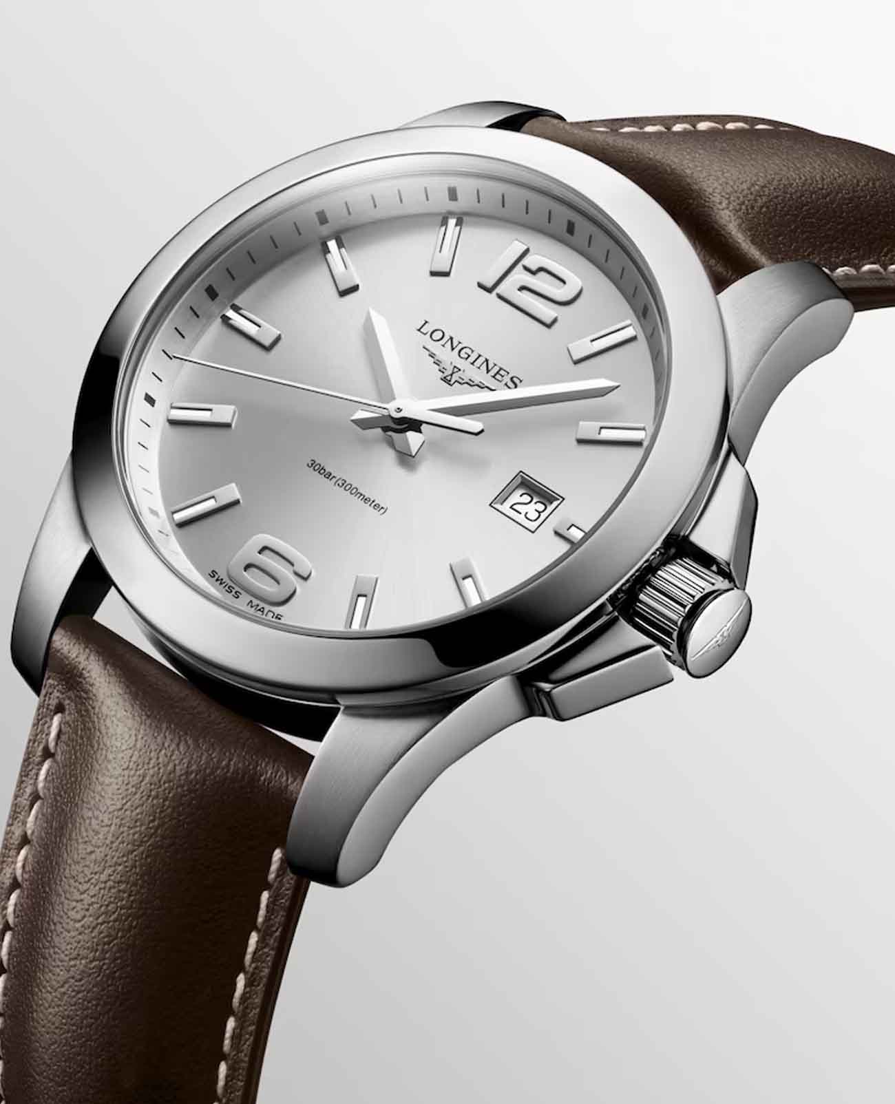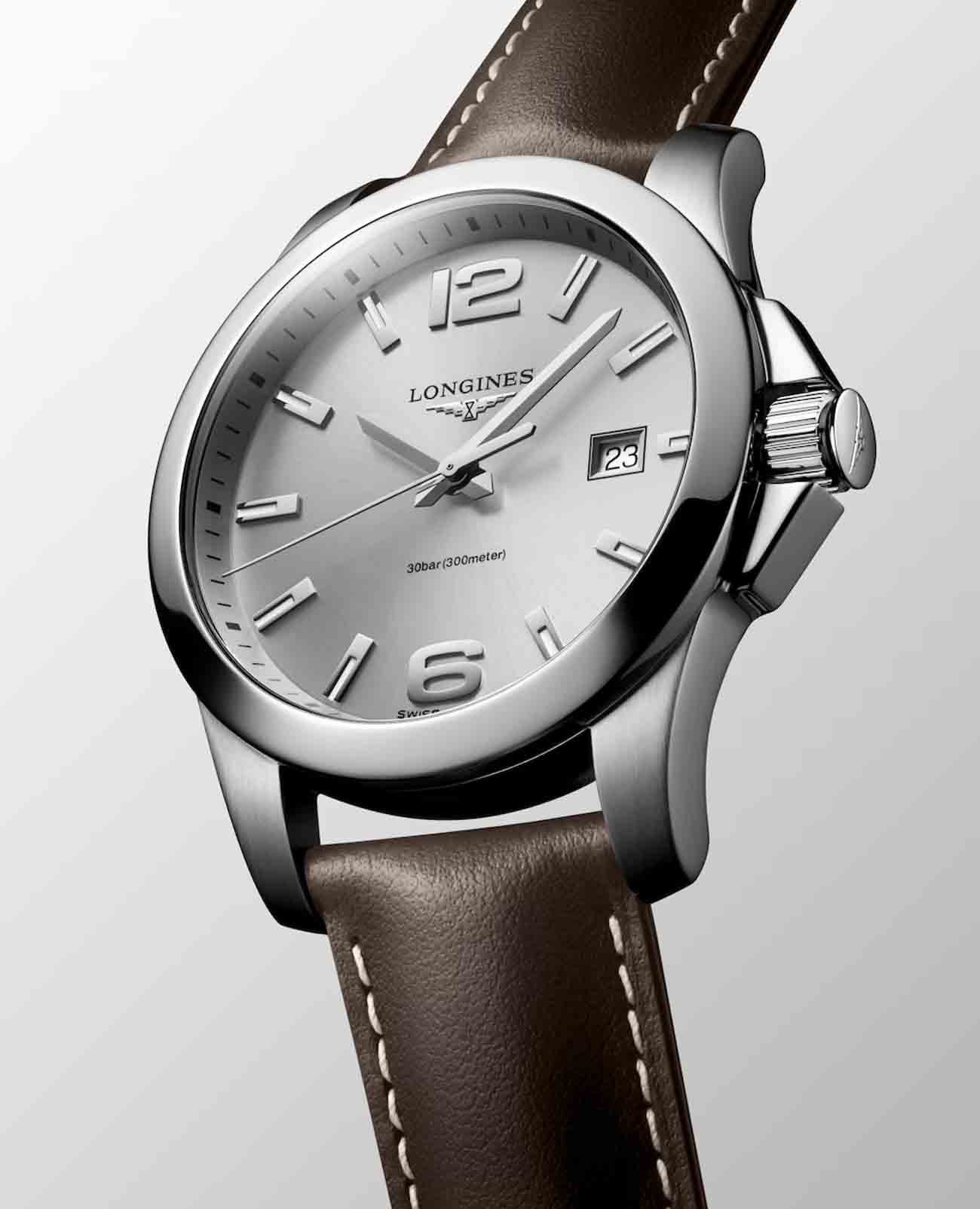 Мужские кварцевые швейцарские часы Longines HydroConquest L3.781.4.56.9. Сапфировое стеклоСапфировое стеклоПрочный и надёжный материал из кристалла сапфира синтетического происхождения, характеризующийся особой твёрдостью и устойчивостью к царапинам и повреждениям. с антибликовым покрытием, устойчивое к мелким механическим повреждениям. Корпус часов изготовлен из нержавеющей стали. Стрелки и метки с люминесцентным покрытиемЛюминесцентное покрытиеПозволяет считывать показания времени в темноте. Производители наносят на стрелки, часовые индексы, безель или поверхность циферблата светонакопительный состав, дающий холодное свечение.. Окошко даты находится в положении 3 часа. Класс водозащиты: 300 метров, позволит плавать, нырять и заниматься другими водными видами спорта. Кожаный ремешок на раскладной застёжкеРаскладная застёжкаТакой тип застёжки используется только на браслетах из металла. Она никогда не раскрывается полностью, происходит разделение на 2 и более частей. Раскладывающая застёжка снизит вероятность потери часов к минимуму..