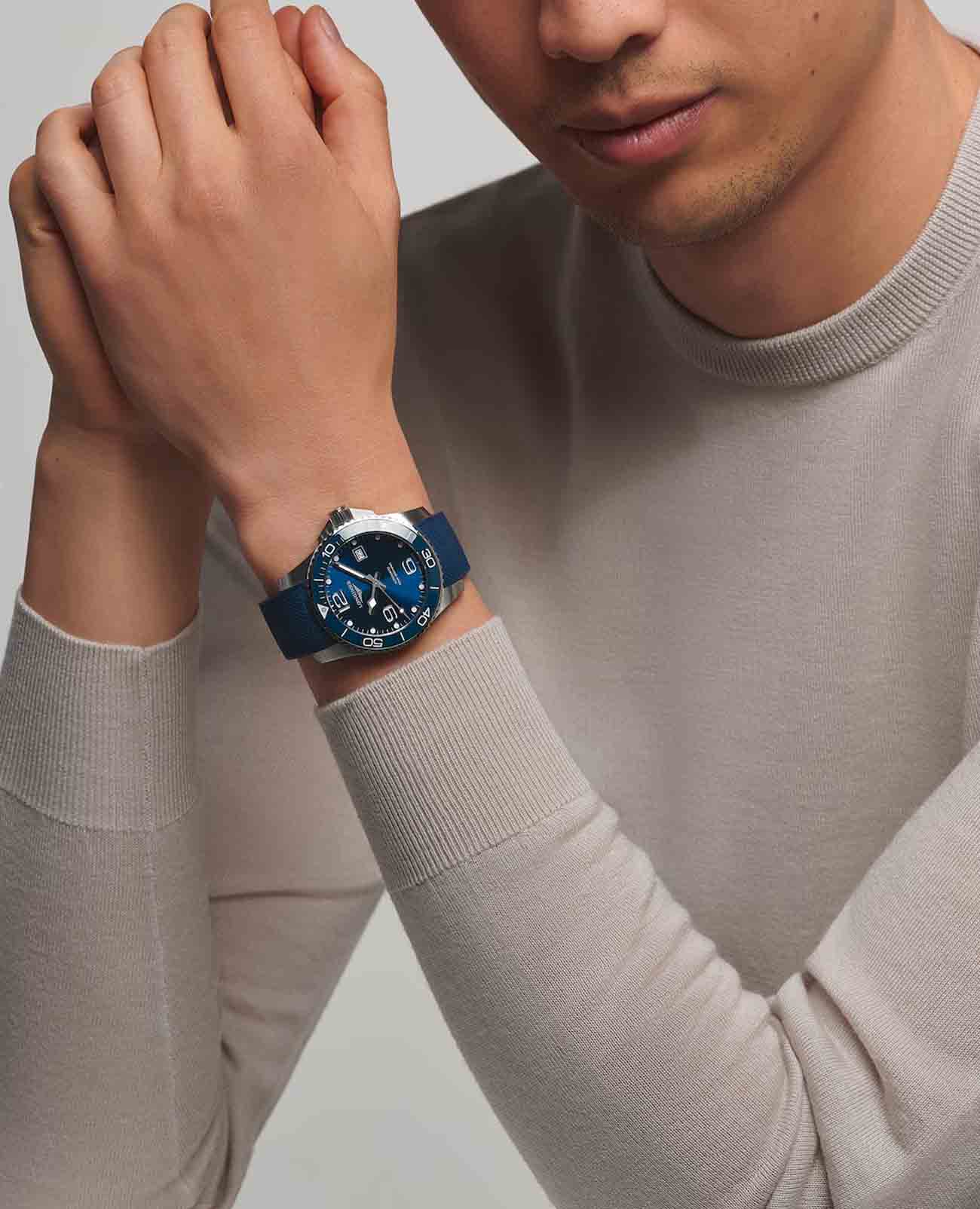 Мужские механические швейцарские часы с автоподзаводом Longines HydroConquest L3.781.4.96.9. Сапфировое стеклоСапфировое стеклоПрочный и надёжный материал из кристалла сапфира синтетического происхождения, характеризующийся особой твёрдостью и устойчивостью к царапинам и повреждениям. с антибликовым покрытием, устойчивое к мелким механическим повреждениям. Корпус часов изготовлен из нержавеющей стали. Вращающийся стальной безельБезельВнешний ободок, закрепляющий стекло. В спортивных часах так называется поворотное кольцо с делениями на циферблате, выполняет роль таймера – замеряет отрезки времени на шкале. Неподвижный безель – элемент декора. Однонаправленно вращающийся безель на дайверских часах позволяет фиксировать моменты погружения и выныривания на поверхность. с люминесцентным покрытиемЛюминесцентное покрытиеПозволяет считывать показания времени в темноте. Производители наносят на стрелки, часовые индексы, безель или поверхность циферблата светонакопительный состав, дающий холодное свечение. Superluminova из нержавеющей стали с PVD-покрытиемPVDУльтратонкое покрытие наносится в технике вакуумного напыления, сочетает в себе нитрид титана особой прочности со слоем золота или оксида хрома. Несёт в себе декоративную или защитную функцию. и керамики, защищенный от царапин, никогда не изнашивается и не выцветает. Стрелки и метки с люминесцентным покрытиемЛюминесцентное покрытиеПозволяет считывать показания времени в темноте. Производители наносят на стрелки, часовые индексы, безель или поверхность циферблата светонакопительный состав, дающий холодное свечение.. Окошко даты находится в положении 3 часа. Класс водозащиты: 300 метров, позволит плавать, нырять и заниматься другими водными видами спорта. Каучковый ремешок на раскладной застёжкеРаскладная застёжкаТакой тип застёжки используется только на браслетах из металла. Она никогда не раскрывается полностью, происходит разделение на 2 и более частей. Раскладывающая застёжка снизит вероятность потери часов к минимуму..