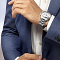 Дополнительные особенности: сапфировое стеклоСапфировое стеклоПрочный и надёжный материал из кристалла сапфира синтетического происхождения, характеризующийся особой твёрдостью и устойчивостью к царапинам и повреждениям. с двухсторонним антибликовым покрытиемАнтибликовое покрытиеСлой оксида металла в 0,13-0,3 микрон, благодаря которому стекло часов не бликует и не отражает свет. Антибликовое покрытие уменьшает отражение света в 10 раз, обеспечивая отличную читаемость показателей циферблата. и люминесцентной подсветкойЛюминесцентное покрытиеПозволяет считывать показания времени в темноте. Производители наносят на стрелки, часовые индексы, безель или поверхность циферблата светонакопительный состав, дающий холодное свечение.. Часы показывают время, минуты и малую секундную стрелку, расположенную на отметке 9 часов. Класс водозащиты: 100 метров, что позволяет плавать, нырять и заниматься другими водными видами спорта. Стальной браслет на раскладной застёжкеРаскладная застёжкаТакой тип застёжки используется только на браслетах из металла. Она никогда не раскрывается полностью, происходит разделение на 2 и более частей. Раскладывающая застёжка снизит вероятность потери часов к минимуму..