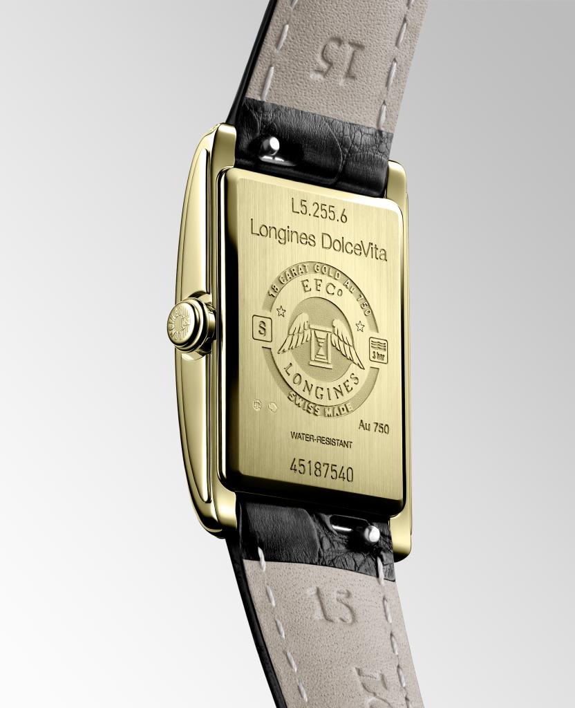 Женские швейцарские часы Longines DolceVita L5.255.6.71.0, кварцевый механизм с высокой точностью. Сапфировое стеклоСапфировое стеклоПрочный и надёжный материал из кристалла сапфира синтетического происхождения, характеризующийся особой твёрдостью и устойчивостью к царапинам и повреждениям. устойчивое к появлению царапин, обладающее высокой прозрачностью. Корпус часов изготовлен из 18-каратного золота18-каратное золотоОбозначение по каратной системе пробирования, оно показывает, сколько драгоценного металла содержится в изделии. 18 карат - в составе 75% чистого золота, соответствует 750 пробе.