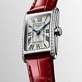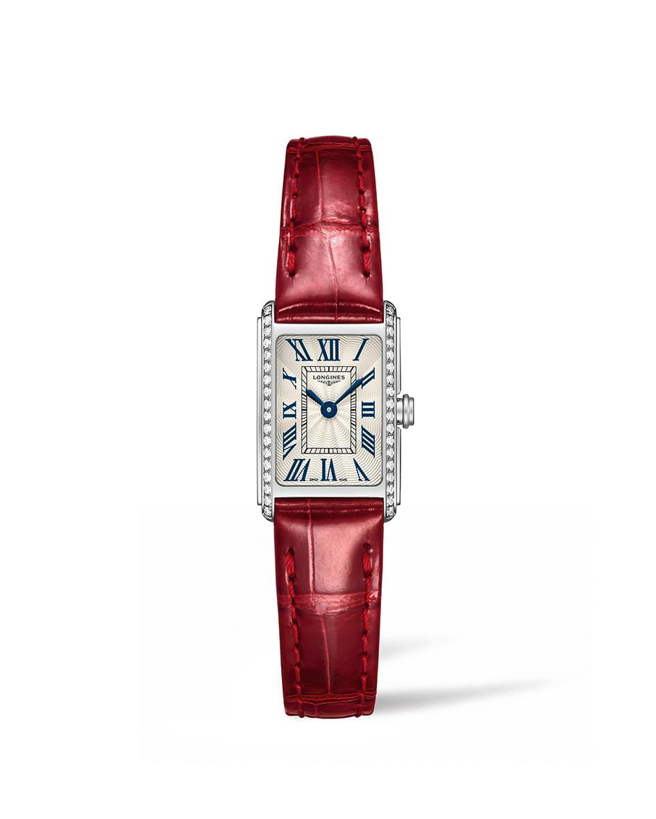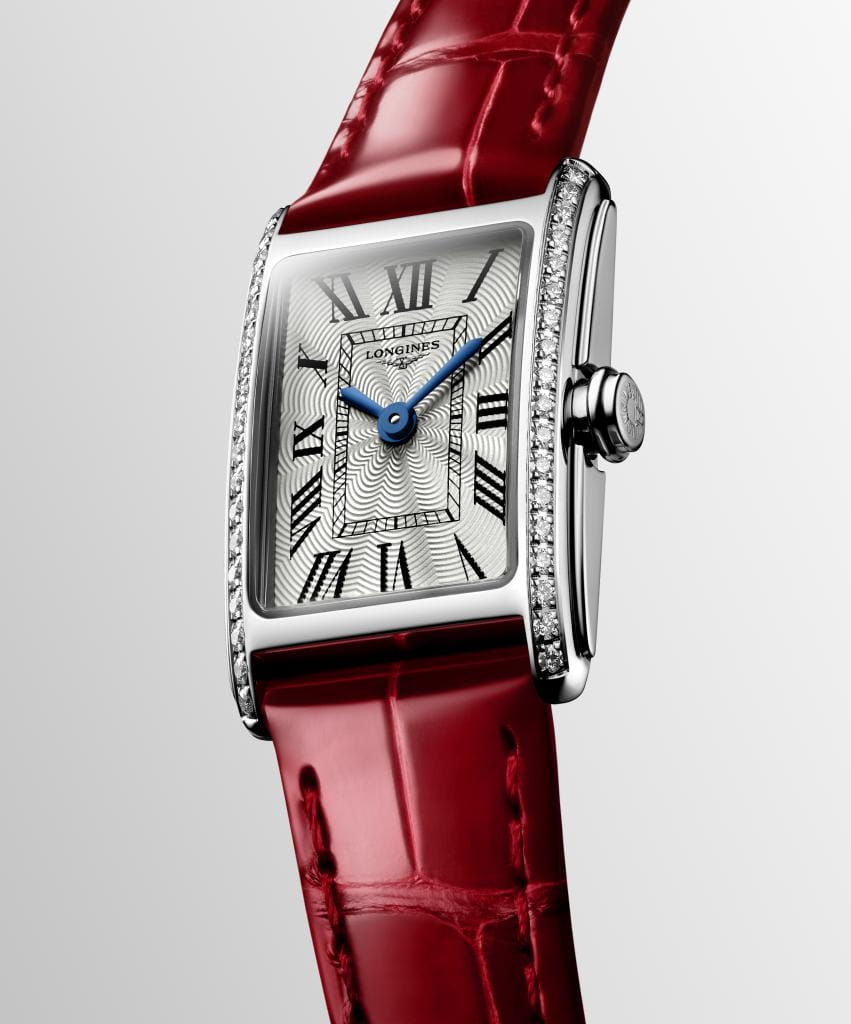 Женские швейцарские часы Longines DolceVita L5.258.0.71.5, кварцевый механизм с высокой точностью. Сапфировое стеклоСапфировое стеклоПрочный и надёжный материал из кристалла сапфира синтетического происхождения, характеризующийся особой твёрдостью и устойчивостью к царапинам и повреждениям. устойчивое к появлению царапин, обладающее высокой прозрачностью. Корпус часов изготовлен из нержавеющей стали с 36 бриллиантами группы Top Wesselton IF-VVS общим весом 0.280 карата. Метки в виде римских цифр. Класс водозащиты: 30 метров, позволит защитить корпус от случайных брызг или капель дождя. Ремешок из кожи аллигатора на стандартной застежке.