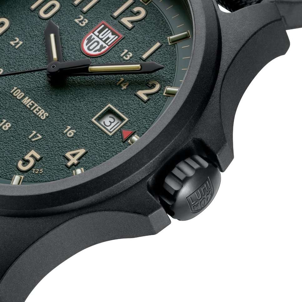 Часы Luminox XL.1977 – это воплощение швейцарского качества и надежности, созданные специально для активных мужчин, которые живут в ритме приключений. Эти часы получили свое название в честь пустыни Атакама, самой сухой в мире, что подчеркивает их выносливость и приспособленность к суровым условиям. Модель оснащена кварцевым механизмом с калибром Ronda 515, что обеспечивает высокую точность хода. Корпус выполнен из пластика, усиленного прессованным карбоном CARBONOX, что делает его прочным и легким. Зеленый текстурированный циферблат напоминает о суровом ландшафте пустыни, а метки в виде штрихов и арабских цифр обеспечивают легкость считывания времени. Часы обладают водозащитой 100WR, что позволяет не беспокоиться о них в условиях повышенной влажности. Специальная LLTLLTLLT — это автономный механизм подсветки, основанный на использовании микроскопических газонаполненных элементов. Специальные герметичные капсулы из боросиликатного стекла, интегрированные в циферблат, генерируют свечение без необходимости подключения к внешним источникам энергии. Для их работы не требуется ни дополнительный свет, ни механическое воздействие (например, нажатие кнопки). Свечение возникает благодаря химическому процессу: реакция между тритием, заключенным в капсулах, и люминофорным покрытием создает стабильное автономное освещение. Технология обеспечивает энергетическую независимость и долговечность подсветки.-подсветка гарантирует непревзойденную видимость в темное время суток на протяжении 25 лет. Окошко даты удобно расположено в положении 3 часа, а заводная головка с защитой и дополнительными прокладками обеспечивает надежную герметичность. Стальная задняя крышка крепится на четырех винтах и украшена выгравированным изображением компаса, что добавляет модели уникальности. Часы имеют габариты: диаметр 43 мм, толщина 13 мм, ширина ремешка 23 мм. Ремешок выполнен из каучука с текстильной вставкой и оснащен классической застежкой, что обеспечивает комфортное ношение в течение всего дня. Сапфировое стеклоСапфировое стеклоПрочный и надёжный материал из кристалла сапфира синтетического происхождения, характеризующийся особой твёрдостью и устойчивостью к царапинам и повреждениям. с антибликовым покрытиемАнтибликовое покрытиеСлой оксида металла в 0,13-0,3 микрон, благодаря которому стекло часов не бликует и не отражает свет. Антибликовое покрытие уменьшает отражение света в 10 раз, обеспечивая отличную читаемость показателей циферблата. защищает циферблат от царапин и обеспечивает отличную видимость при любом освещении.