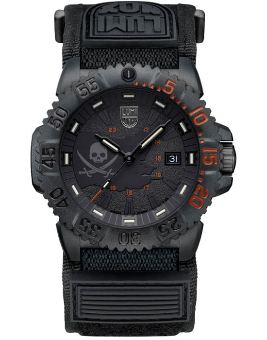 Luminox XS.3051.PIR.LE — лимитированная модель серии Navy SEAL 3050 с характерным брутальным стилем и высокой надёжностью. Корпус диаметром 44 мм выполнен из углепластика Carbon Core GuardCarbon Core Guard Новейшая структура корпуса, разработанная Casio. Полиуретановая пластина дополнительно усилена карбоновыми вставками, что придаёт специальную защиту от механических повреждений. Карбон отличается лёгкостью и прочностью., что делает его лёгким и устойчивым к ударам, а безельБезельВнешний ободок, закрепляющий стекло. В спортивных часах так называется поворотное кольцо с делениями на циферблате, выполняет роль таймера – замеряет отрезки времени на шкале. Неподвижный безель – элемент декора. Однонаправленно вращающийся безель на дайверских часах позволяет фиксировать моменты погружения и выныривания на поверхность. с минутной разметкой вращается в одном направлении, обеспечивая удобство при погружениях. Защитную функцию выполняет закалённое минеральное стеклоМинеральное стеклоМинеральное стекло представляет собой искусственно выращенный минерал кварца. Такое стекло отличается особой устойчивостью к повреждениям и царапинам. Уступает по некоторым качествам сапфировому стеклу.. Механизм — точный швейцарский кварцевый, с функциями часов, минут, секунд и даты. Метки и стрелки оснащены системой постоянной подсветки Luminox Light Technology с автономной работой до 25 лет, обеспечивающей читаемость даже в полной темноте. Водозащита 200 м (20 бар) делает модель надёжным инструментом для дайвинга. Часы дополнены полиуретановым ремешком с классической застёжкой, который подчёркивает их практичность и комфорт в носке.