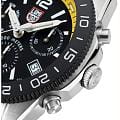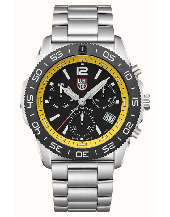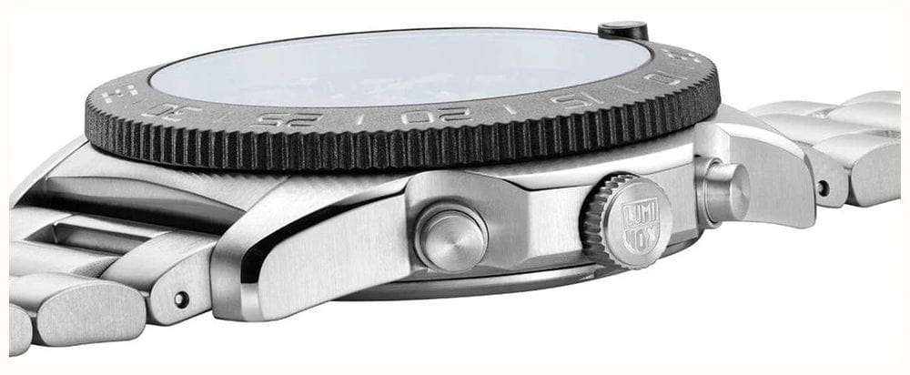 Мужские наручные часы-хронографХронографФункция позволяет измерять отрезки времени с особой точностью: часы, минуты, секунды. Верным признаком хронографа является наличие на циферблате 3 дополнительных окошек-счётчиков. Luminox XS.3145.M из коллекции Pacific Diver сочетают в себе спортивный дизайн и надежность швейцарского качества . Модель обладает круглым корпусом диаметром 44 мм, изготовленным из нержавеющей стали, что обеспечивает высокую устойчивость к внешним воздействиям и долговечность . Циферблат черного цвета украшен контрастными метками и стрелками с люминесцентным покрытиемЛюминесцентное покрытиеПозволяет считывать показания времени в темноте. Производители наносят на стрелки, часовые индексы, безель или поверхность циферблата светонакопительный состав, дающий холодное свечение., гарантирующим постоянную видимость времени даже в условиях низкой освещенности благодаря системе LLTLLTLLT — это автономный механизм подсветки, основанный на использовании микроскопических газонаполненных элементов. Специальные герметичные капсулы из боросиликатного стекла, интегрированные в циферблат, генерируют свечение без необходимости подключения к внешним источникам энергии. Для их работы не требуется ни дополнительный свет, ни механическое воздействие (например, нажатие кнопки). Свечение возникает благодаря химическому процессу: реакция между тритием, заключенным в капсулах, и люминофорным покрытием создает стабильное автономное освещение. Технология обеспечивает энергетическую независимость и долговечность подсветки. (микрогазовые огни) . Часы оснащены кварцевым механизмом швейцарского производства, обеспечивающим точность хода ±15 секунд в месяц . Защиту циферблата обеспечивает прочное сапфировое стеклоСапфировое стеклоПрочный и надёжный материал из кристалла сапфира синтетического происхождения, характеризующийся особой твёрдостью и устойчивостью к царапинам и повреждениям. с антибликовым покрытиемАнтибликовое покрытиеСлой оксида металла в 0,13-0,3 микрон, благодаря которому стекло часов не бликует и не отражает свет. Антибликовое покрытие уменьшает отражение света в 10 раз, обеспечивая отличную читаемость показателей циферблата., устойчивое к царапинам и механическим повреждениям . Водонепроницаемость модели достигает 20 атмосфер (200 метров), что делает их подходящими для плавания и активного отдыха на воде, включая дайвинг . Модель также оснащена безелемБезельВнешний ободок, закрепляющий стекло. В спортивных часах так называется поворотное кольцо с делениями на циферблате, выполняет роль таймера – замеряет отрезки времени на шкале. Неподвижный безель – элемент декора. Однонаправленно вращающийся безель на дайверских часах позволяет фиксировать моменты погружения и выныривания на поверхность. с односторонним вращением, что добавляет функциональности при использовании в водных условиях . Стальной браслет на раскладной застёжкеРаскладная застёжкаТакой тип застёжки используется только на браслетах из металла. Она никогда не раскрывается полностью, происходит разделение на 2 и более частей. Раскладывающая застёжка снизит вероятность потери часов к минимуму.. Дополнительно часы имеют окно даты в положении «4 часа», что делает их практичными для повседневного использования .
