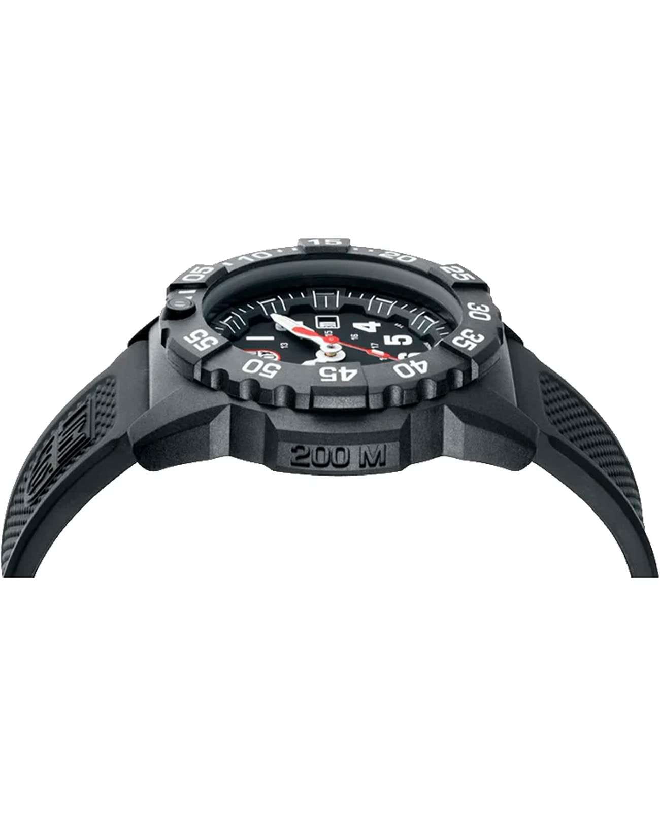 Мужские наручные часы Luminox XS.3501.F из коллекции Navy SEAL сочетают в себе спортивный дизайн и надежность швейцарского качества . Модель обладает круглым корпусом диаметром 45 мм, изготовленным из карбонаКарбонОт «carbon», «carbone» - углерод, углепластик - полимерный композиционный материал из переплетённых под определенным углом между собой нитей углеродного волокна, применяется для изготовления лёгких, но прочных деталей. В часах часто используют для украшения циферблатов и ремешков. Так же карбон используется в изготовлении корпусов. Такие корпуса обладают антикоррозионным свойством, не поддаются электромагнитному излучению, обладают повышенной прочностью и противоударностью. (CARBONOX™), что обеспечивает высокую устойчивость к внешним воздействиям при сохранении легкости . Циферблат черного цвета украшен контрастными метками и стрелками с , гарантирующим постоянную видимость времени даже в условиях низкой освещенности благодаря системе LLTLLTLLT — это автономный механизм подсветки, основанный на использовании микроскопических газонаполненных элементов. Специальные герметичные капсулы из боросиликатного стекла, интегрированные в циферблат, генерируют свечение без необходимости подключения к внешним источникам энергии. Для их работы не требуется ни дополнительный свет, ни механическое воздействие (например, нажатие кнопки). Свечение возникает благодаря химическому процессу: реакция между тритием, заключенным в капсулах, и люминофорным покрытием создает стабильное автономное освещение. Технология обеспечивает энергетическую независимость и долговечность подсветки. (микрогазовые огни) . Часы оснащены кварцевым механизмом швейцарского производства Ronda 715, обеспечивающим точность хода ±15 секунд в месяц . Защиту циферблата обеспечивает прочное минеральное стеклоМинеральное стеклоМинеральное стекло представляет собой искусственно выращенный минерал кварца. Такое стекло отличается особой устойчивостью к повреждениям и царапинам. Уступает по некоторым качествам сапфировому стеклу. с антибликовым покрытиемАнтибликовое покрытиеСлой оксида металла в 0,13-0,3 микрон, благодаря которому стекло часов не бликует и не отражает свет. Антибликовое покрытие уменьшает отражение света в 10 раз, обеспечивая отличную читаемость показателей циферблата., устойчивое к царапинам и механическим повреждениям . Водонепроницаемость модели достигает 20 атмосфер (200 метров), что делает их подходящими для плавания и активного отдыха на воде, включая дайвинг . Модель также оснащена безелемБезельВнешний ободок, закрепляющий стекло. В спортивных часах так называется поворотное кольцо с делениями на циферблате, выполняет роль таймера – замеряет отрезки времени на шкале. Неподвижный безель – элемент декора. Однонаправленно вращающийся безель на дайверских часах позволяет фиксировать моменты погружения и выныривания на поверхность. с односторонним вращением, что добавляет функциональности при использовании в водных условиях . Ремешок выполнен из черного полиуретана, что обеспечивает комфортное ношение в течение дня и удобство в уходе . Дополнительно часы имеют окно даты в положении «3 часа», что делает их практичными для повседневного использования .