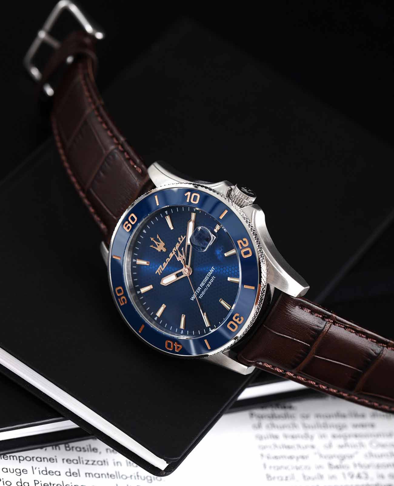 Мужские итальянские часы Maserati Competizione R8851100004, кварцевый механизм с высокой точностью. Корпус часов изготовлен из стали. БезельБезельВнешний ободок, закрепляющий стекло. В спортивных часах так называется поворотное кольцо с делениями на циферблате, выполняет роль таймера – замеряет отрезки времени на шкале. Неподвижный безель – элемент декора. Однонаправленно вращающийся безель на дайверских часах позволяет фиксировать моменты погружения и выныривания на поверхность. из стали с PVD-покрытиемPVDУльтратонкое покрытие наносится в технике вакуумного напыления, сочетает в себе нитрид титана особой прочности со слоем золота или оксида хрома. Несёт в себе декоративную или защитную функцию.. Стрелки с люминесцентным покрытиемЛюминесцентное покрытиеПозволяет считывать показания времени в темноте. Производители наносят на стрелки, часовые индексы, безель или поверхность циферблата светонакопительный состав, дающий холодное свечение.. Окошко даты находится в положении 3 часа. Класс водозащиты: 100 метров, позволит плавать, нырять и заниматься другими водными видами спорта. Кожаный ремешок на стандартной застежке.