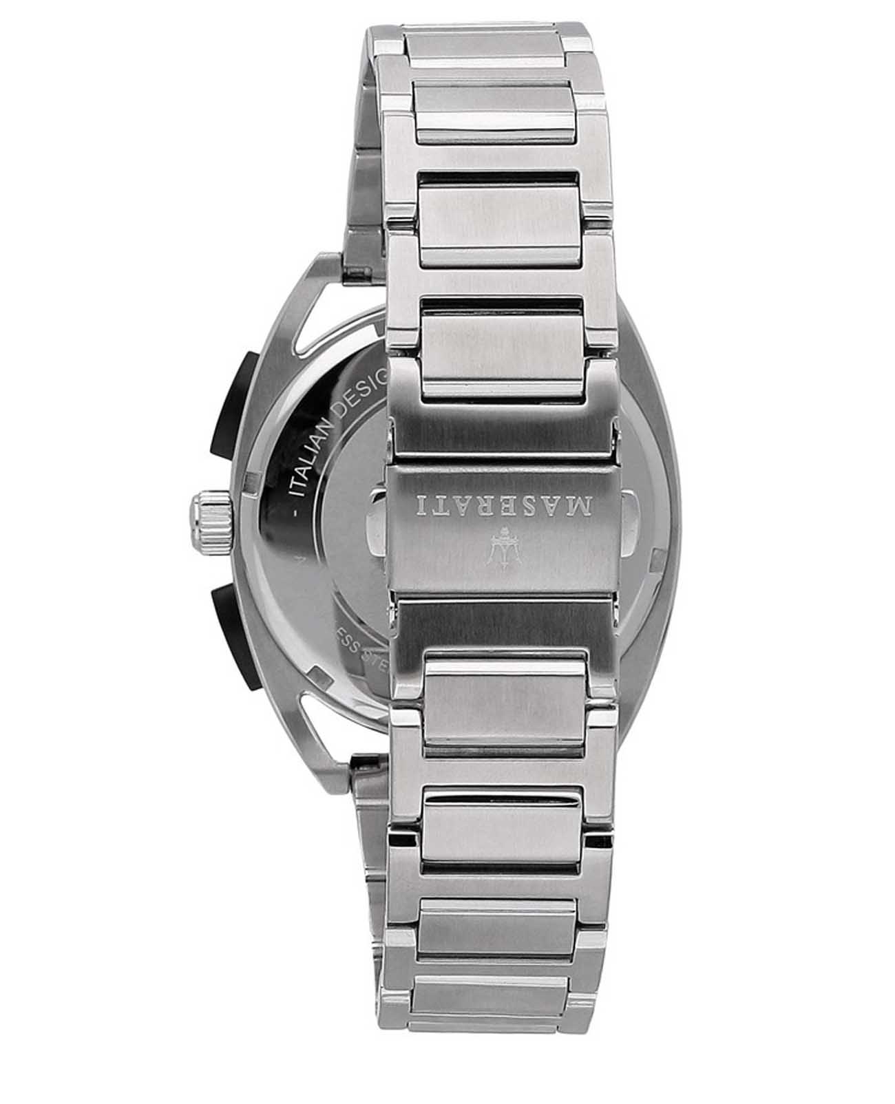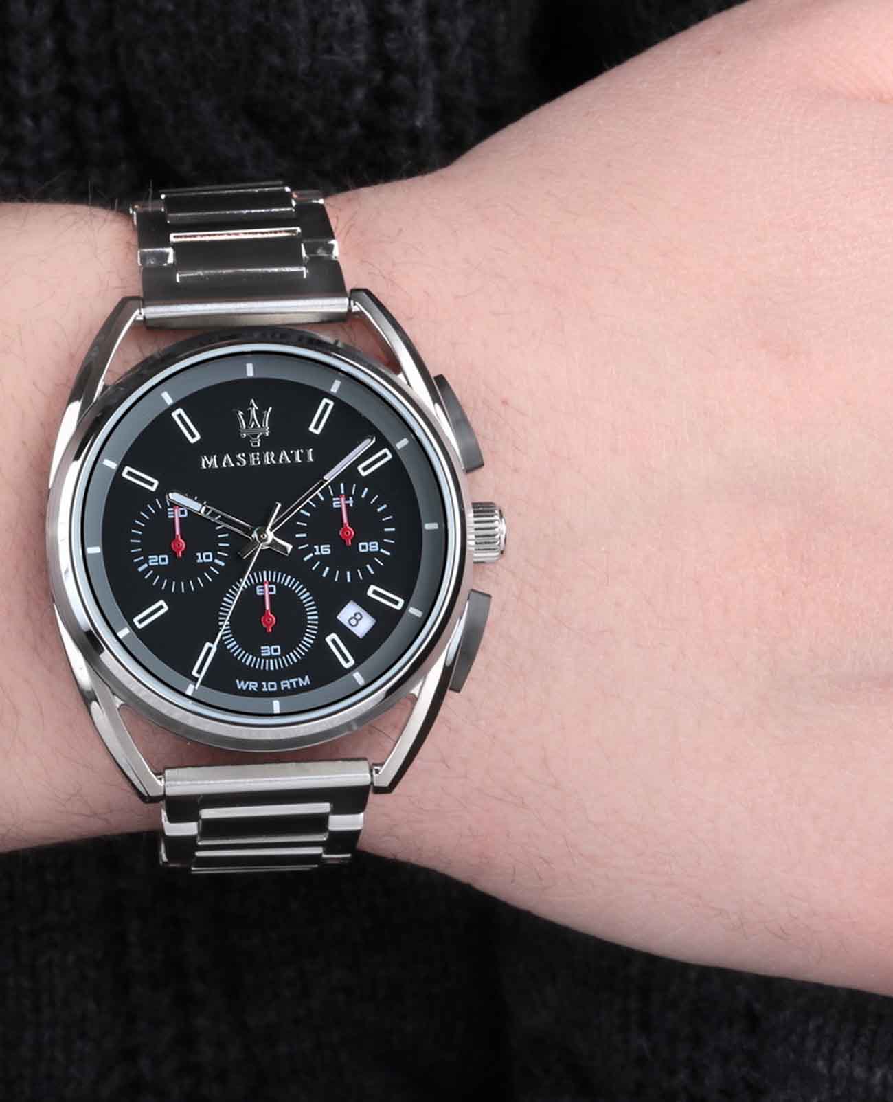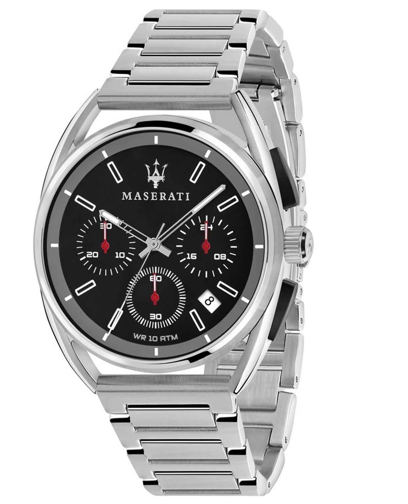 Мужские итальянские часы c хронографомХронографФункция позволяет измерять отрезки времени с особой точностью: часы, минуты, секунды. Верным признаком хронографа является наличие на циферблате 3 дополнительных окошек-счётчиков. Maserati Trimarano R8873632003, кварцевый механизм с высокой точностью. Корпус часов изготовлен из стали. Стрелки с люминесцентным покрытиемЛюминесцентное покрытиеПозволяет считывать показания времени в темноте. Производители наносят на стрелки, часовые индексы, безель или поверхность циферблата светонакопительный состав, дающий холодное свечение.. Класс водозащиты: 100 метров, позволит плавать, нырять и заниматься другими водными видами спорта. Стальной браслет на раскладной застёжкойРаскладная застёжкаТакой тип застёжки используется только на браслетах из металла. Она никогда не раскрывается полностью, происходит разделение на 2 и более частей. Раскладывающая застёжка снизит вероятность потери часов к минимуму..