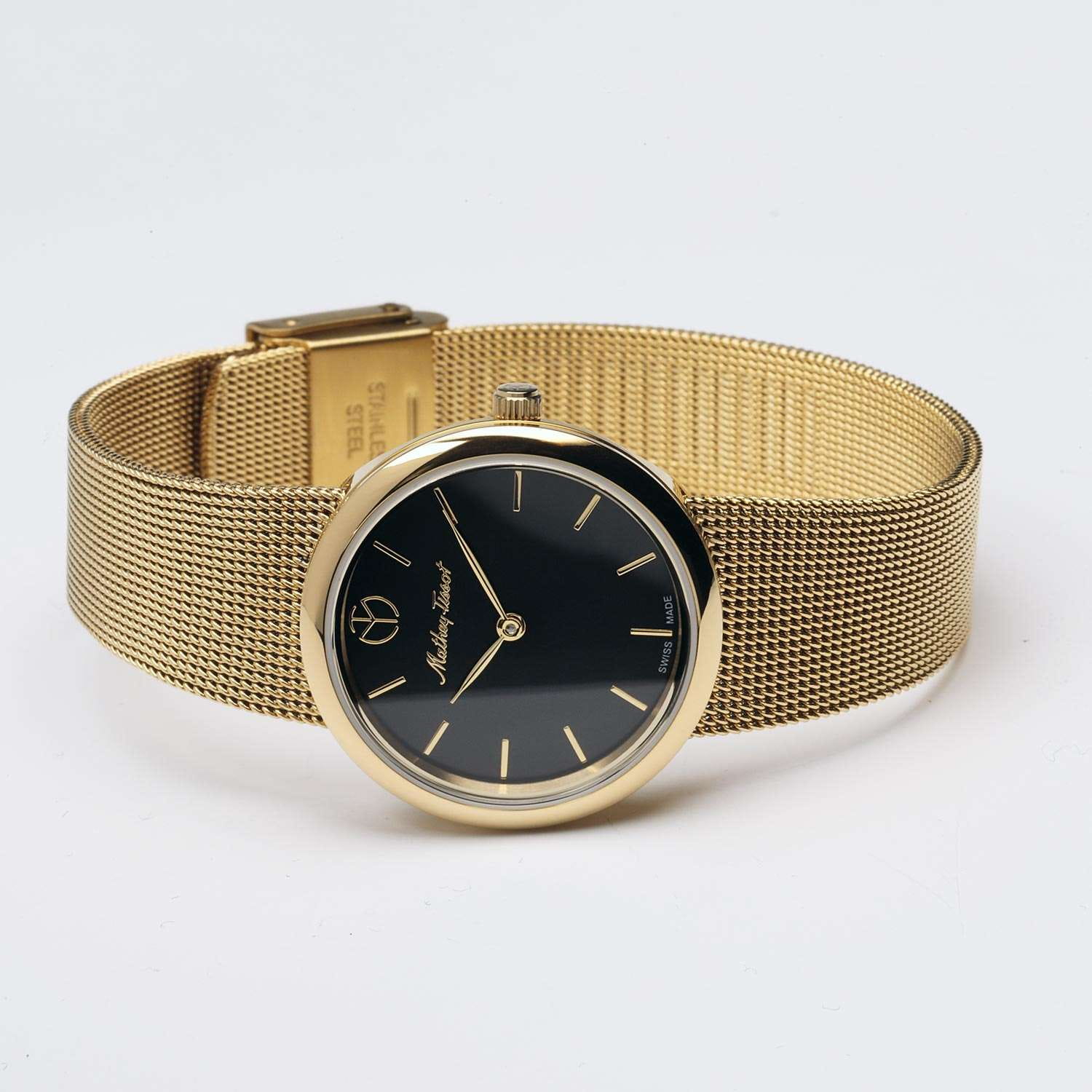 Женские кварцевые часы Mathey-Tissot Milly D403PYN — это стильное сочетание элегантности и современного дизайна. Изящный корпус выполнен из нержавеющей стали с PVD-покрытиемPVDУльтратонкое покрытие наносится в технике вакуумного напыления, сочетает в себе нитрид титана особой прочности со слоем золота или оксида хрома. Несёт в себе декоративную или защитную функцию. золотистого цвета, диаметром 30 мм, что придаст образу элегантности и надежности. Изысканный перламутровый циферблат с метками в виде штрихов придает модели особый блеск. Циферблат защищен минеральным стекломМинеральное стеклоМинеральное стекло представляет собой искусственно выращенный минерал кварца. Такое стекло отличается особой устойчивостью к повреждениям и царапинам. Уступает по некоторым качествам сапфировому стеклу. с сапфировым покрытием, обеспечивает устойчивость к царапинам. Часы оснащены надежным кварцевым механизмом. Стальной браслет с PVD-покрытиемPVDУльтратонкое покрытие наносится в технике вакуумного напыления, сочетает в себе нитрид титана особой прочности со слоем золота или оксида хрома. Несёт в себе декоративную или защитную функцию. миланского плетения на раскладном замкеРаскладная застёжкаТакой тип застёжки используется только на браслетах из металла. Она никогда не раскрывается полностью, происходит разделение на 2 и более частей. Раскладывающая застёжка снизит вероятность потери часов к минимуму., гарантирует комфортное и безопасное ношение. Класс водозащиты: 30 метров позволит защитить корпус от случайных брызг или капель дождя. Mathey-Tissot  — отличный выбор для тех, кто ценит утонченность и качество.