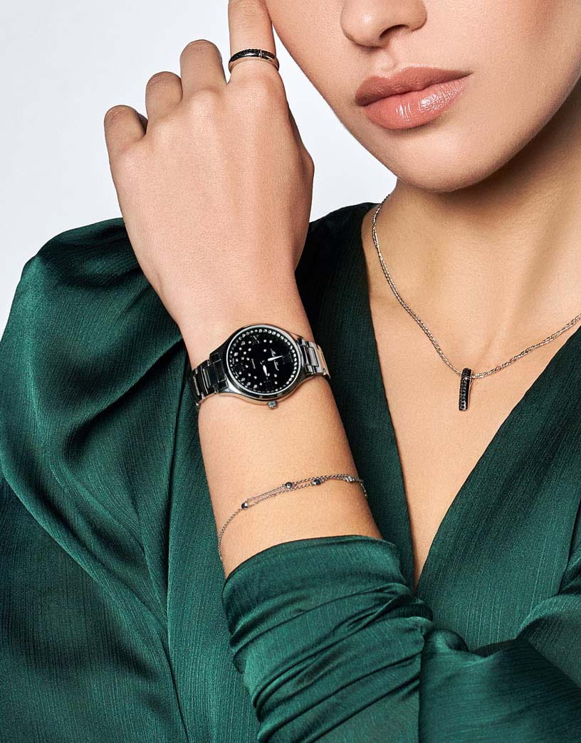 Женские кварцевые часы Mathey-Tissot Nicole D985SAN — это стильное сочетание элегантности и современного дизайна. Изящный корпус выполнен из нержавеющей стали, диаметром 32 мм, прекрасно впишется в ваш исключительный стиль. Изысканный циферблат с метками в виде римских цифр придает модели особый блеск и защищен сапфировым стекломСапфировое стеклоПрочный и надёжный материал из кристалла сапфира синтетического происхождения, характеризующийся особой твёрдостью и устойчивостью к царапинам и повреждениям., обеспечивающим устойчивость к царапинам. Циферблат украшен кристаллами. Мечевидные стрелки в стиле Dauphine. Часы оснащены надежным кварцевым механизмом. Рифленая заводная головка. Стальной браслет на застёжке-бабочке с кнопкамиЗастёжка "бабочка"Такой вид застёжки дополняется предохранителями, помогающими избежать случайного раскрытия браслета. Обладают изящным исполнением. гарантирует комфортное и безопасное ношение. Класс водозащиты: 50 метров позволит защитить корпус от случайных брызг или капель дождя. Mathey-Tissot  — отличный выбор для тех, кто ценит утонченность и качество.