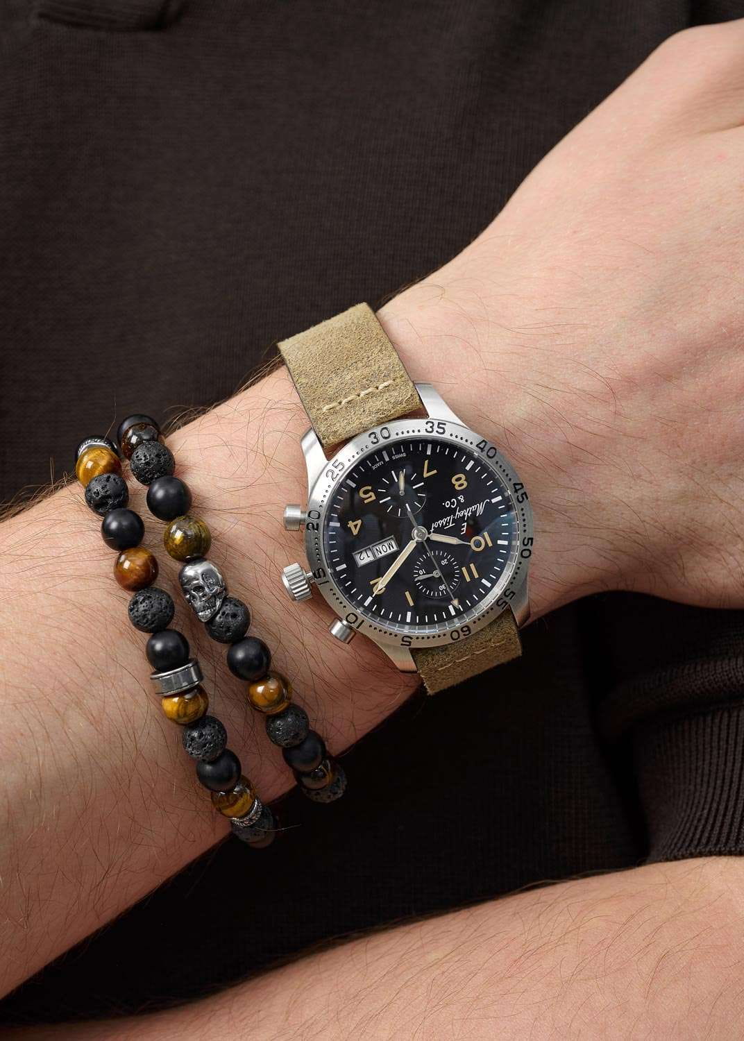 Мужские механические с автоподзаводом часы-хронографХронографФункция позволяет измерять отрезки времени с особой точностью: часы, минуты, секунды. Верным признаком хронографа является наличие на циферблате 3 дополнительных окошек-счётчиков. с секундомеромСекундомерСекундоме́р — прибор, способный измерять интервалы времени с точностью до долей секунды. Mathey-Tissot Type 21 H1821CHATLNO — это стильное сочетание элегантности и современного дизайна. Изящный корпус выполнен из нержавеющей стали, диаметром 42 мм, что придаст образу элегантности и надежности. Изысканный циферблат с метками в виде арабских цифр придает модели особый блеск. Циферблат защищен сапфировым стекломСапфировое стеклоПрочный и надёжный материал из кристалла сапфира синтетического происхождения, характеризующийся особой твёрдостью и устойчивостью к царапинам и повреждениям., обеспечивает устойчивость к царапинам. Стрелки с люминесцентным покрытиемЛюминесцентное покрытиеПозволяет считывать показания времени в темноте. Производители наносят на стрелки, часовые индексы, безель или поверхность циферблата светонакопительный состав, дающий холодное свечение.. Окошко даты находится в положении 3 часа. Кожаный ремешок на застёжке «бабочка» с кнопкамиЗастёжка "бабочка"Такой вид застёжки дополняется предохранителями, помогающими избежать случайного раскрытия браслета. Обладают изящным исполнением. , гарантирует комфортное и безопасное ношение. Рифленая заводная головка. Класс водозащиты: 50 метров позволит защитить корпус от случайных брызг или капель дождя. Mathey-Tissot — отличный выбор для тех, кто ценит утонченность и качество.