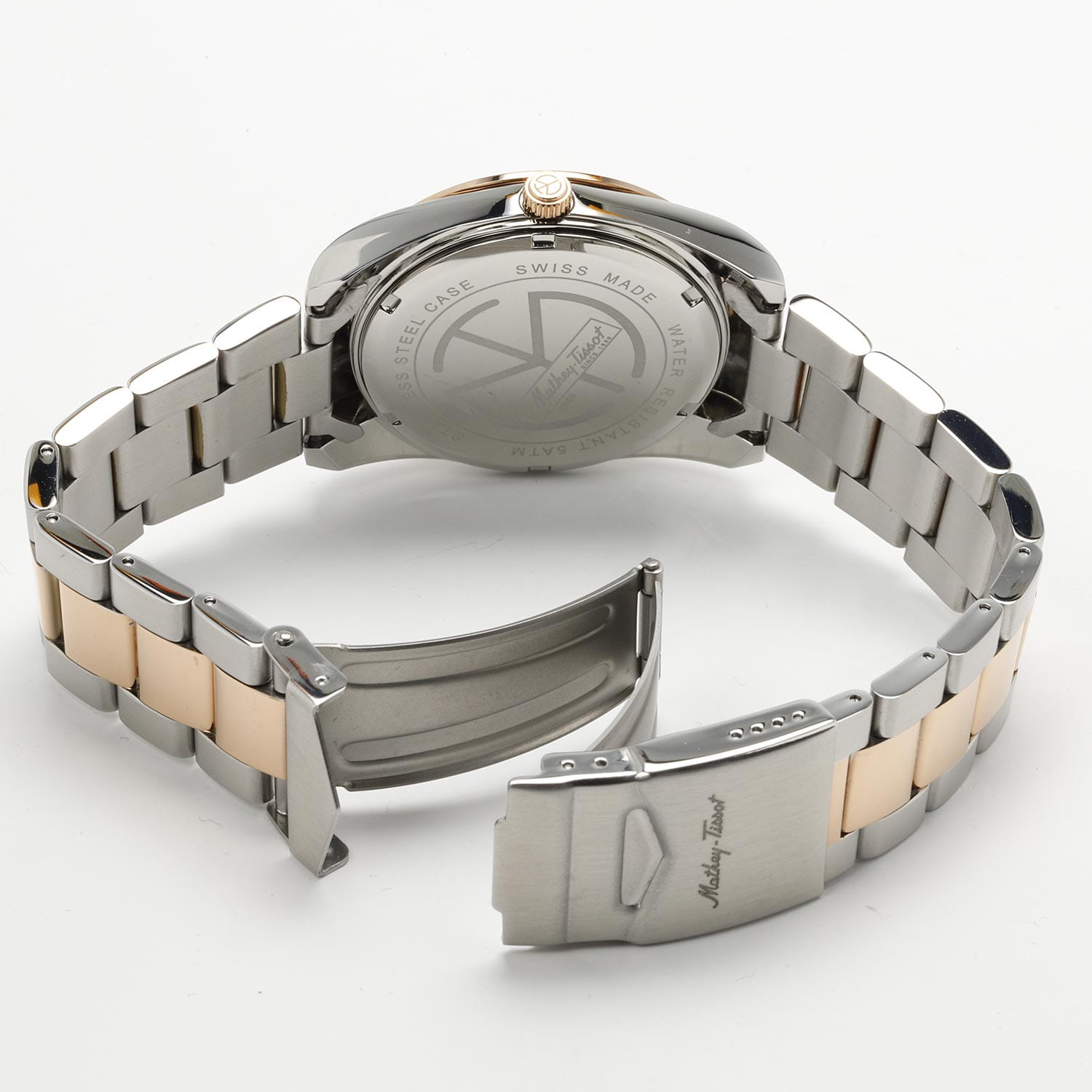 Мужские кварцевые часы Mathey-Tissot Mathy H450RN — это стильное сочетание элегантности и современного дизайна. Изящный корпус выполнен из нержавеющей стали, диаметром 42 мм, что придаст образу элегантности и надежности. Изысканный циферблат с метками в виде штрихов придает модели особый блеск. Циферблат защищен минеральным стекломМинеральное стеклоМинеральное стекло представляет собой искусственно выращенный минерал кварца. Такое стекло отличается особой устойчивостью к повреждениям и царапинам. Уступает по некоторым качествам сапфировому стеклу., обеспечивает устойчивость к царапинам. Стрелки и метки с люминесцентным покрытиемЛюминесцентное покрытиеПозволяет считывать показания времени в темноте. Производители наносят на стрелки, часовые индексы, безель или поверхность циферблата светонакопительный состав, дающий холодное свечение.. БезельБезельВнешний ободок, закрепляющий стекло. В спортивных часах так называется поворотное кольцо с делениями на циферблате, выполняет роль таймера – замеряет отрезки времени на шкале. Неподвижный безель – элемент декора. Однонаправленно вращающийся безель на дайверских часах позволяет фиксировать моменты погружения и выныривания на поверхность. с PVD-покрытиемPVDУльтратонкое покрытие наносится в технике вакуумного напыления, сочетает в себе нитрид титана особой прочности со слоем золота или оксида хрома. Несёт в себе декоративную или защитную функцию. цвета розового золота. Окошко даты находится в положении 3 часа. Часы оснащены надежным кварцевым механизмом. Стальной браслет с частичным PVD-покрытиемPVDУльтратонкое покрытие наносится в технике вакуумного напыления, сочетает в себе нитрид титана особой прочности со слоем золота или оксида хрома. Несёт в себе декоративную или защитную функцию. на раскладной застёжке с фиксаторомРаскладная застёжкаТакой тип застёжки используется только на браслетах из металла. Она никогда не раскрывается полностью, происходит разделение на 2 и более частей. Раскладывающая застёжка снизит вероятность потери часов к минимуму., гарантирует комфортное и безопасное ношение. Рифленая заводная головка. Класс водозащиты: 50 метров позволит защитить корпус от случайных брызг или капель дождя. Mathey-Tissot  — отличный выбор для тех, кто ценит утонченность и качество.