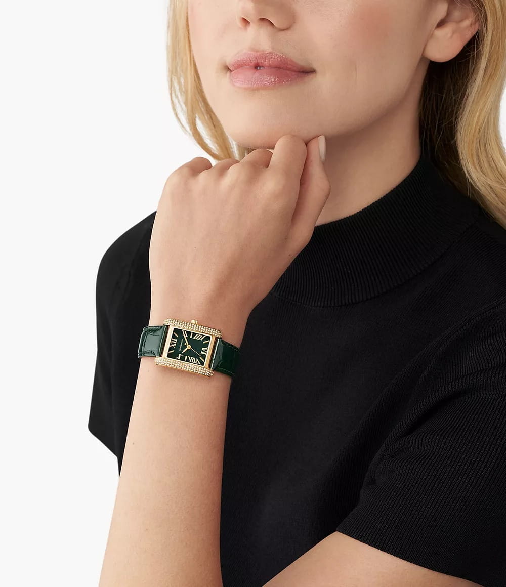 Женские американские наручные часы с минеральным стекломМинеральное стеклоМинеральное стекло представляет собой искусственно выращенный минерал кварца. Такое стекло отличается особой устойчивостью к повреждениям и царапинам. Уступает по некоторым качествам сапфировому стеклу. Michael Kors Emery MK4697, кварцевый механизм с высокой точностью. Минеральное стеклоМинеральное стеклоМинеральное стекло представляет собой искусственно выращенный минерал кварца. Такое стекло отличается особой устойчивостью к повреждениям и царапинам. Уступает по некоторым качествам сапфировому стеклу. устойчивое к появлению царапин, обладающее высокой прозрачностью. Корпус изготовлен из нержавеющей стали с IP-покрытиемIP-покрытиеМетод ионного напыления. Демонстрирует повышенную устойчивость к истиранию, окислению и химическим веществам. Под воздействием высокого давления и температуры около 1500°C молекулы металла надёжно соединяются с частицами корпуса часов.. БезельБезельВнешний ободок, закрепляющий стекло. В спортивных часах так называется поворотное кольцо с делениями на циферблате, выполняет роль таймера – замеряет отрезки времени на шкале. Неподвижный безель – элемент декора. Однонаправленно вращающийся безель на дайверских часах позволяет фиксировать моменты погружения и выныривания на поверхность. с IP-покрытиемIP-покрытиеМетод ионного напыления. Демонстрирует повышенную устойчивость к истиранию, окислению и химическим веществам. Под воздействием высокого давления и температуры около 1500°C молекулы металла надёжно соединяются с частицами корпуса часов. из нержавеющей стали украшен кристаллами. Класс водозащиты: 50 метров, позволит защитить корпус от случайных брызг или капель дождя. Кожаный ремешок на стандартной застёжке.