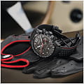 Кожаный ремешок чёрного цвета с красной прострочкой и раскладной застёжкойРаскладная застёжкаТакой тип застёжки используется только на браслетах из металла. Она никогда не раскрывается полностью, происходит разделение на 2 и более частей. Раскладывающая застёжка снизит вероятность потери часов к минимуму. обеспечивает комфортное ношение и надёжную фиксацию. Водозащита до 10 ATM делает модель подходящей для плавания и других водных активностей.