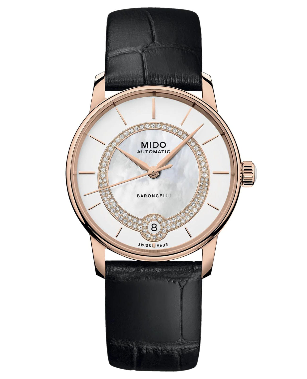 Роскошные и элегантные Baroncelli Lady Necklace декорированы кольцом из бриллиантов, обрамляющим нежный перламутровый циферблат. Mido выбрал для этих округлых и изысканных швейцарских часов автоматический механизм Caliber 80, который славится уникальным запасом хода до 80 часов. Каждый час становится бесценным сокровищем.
