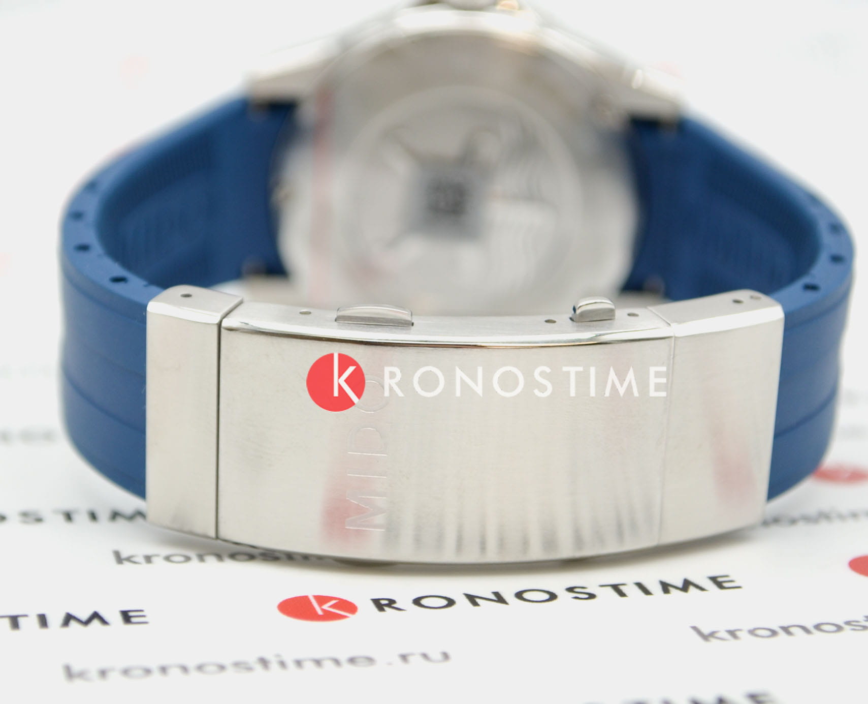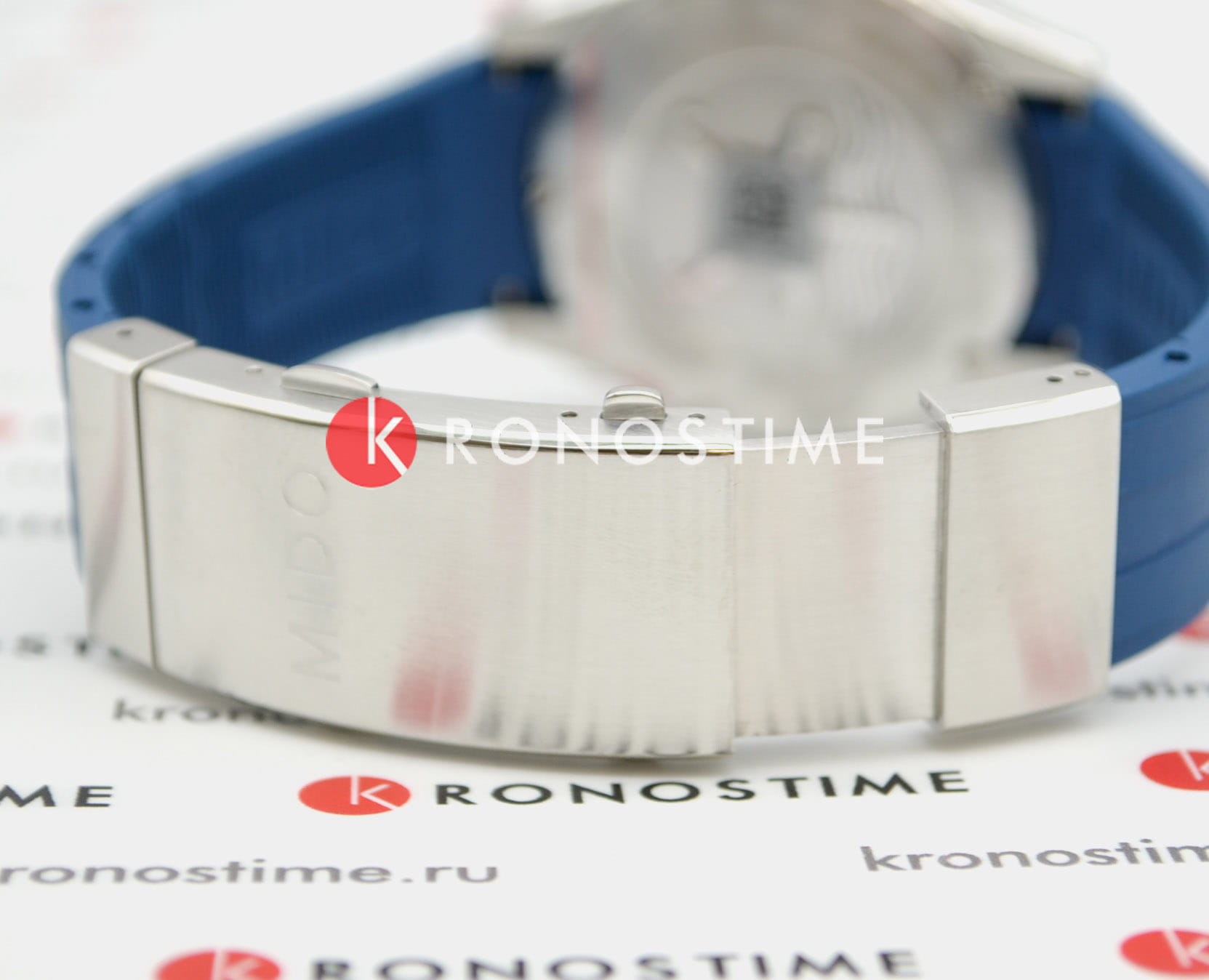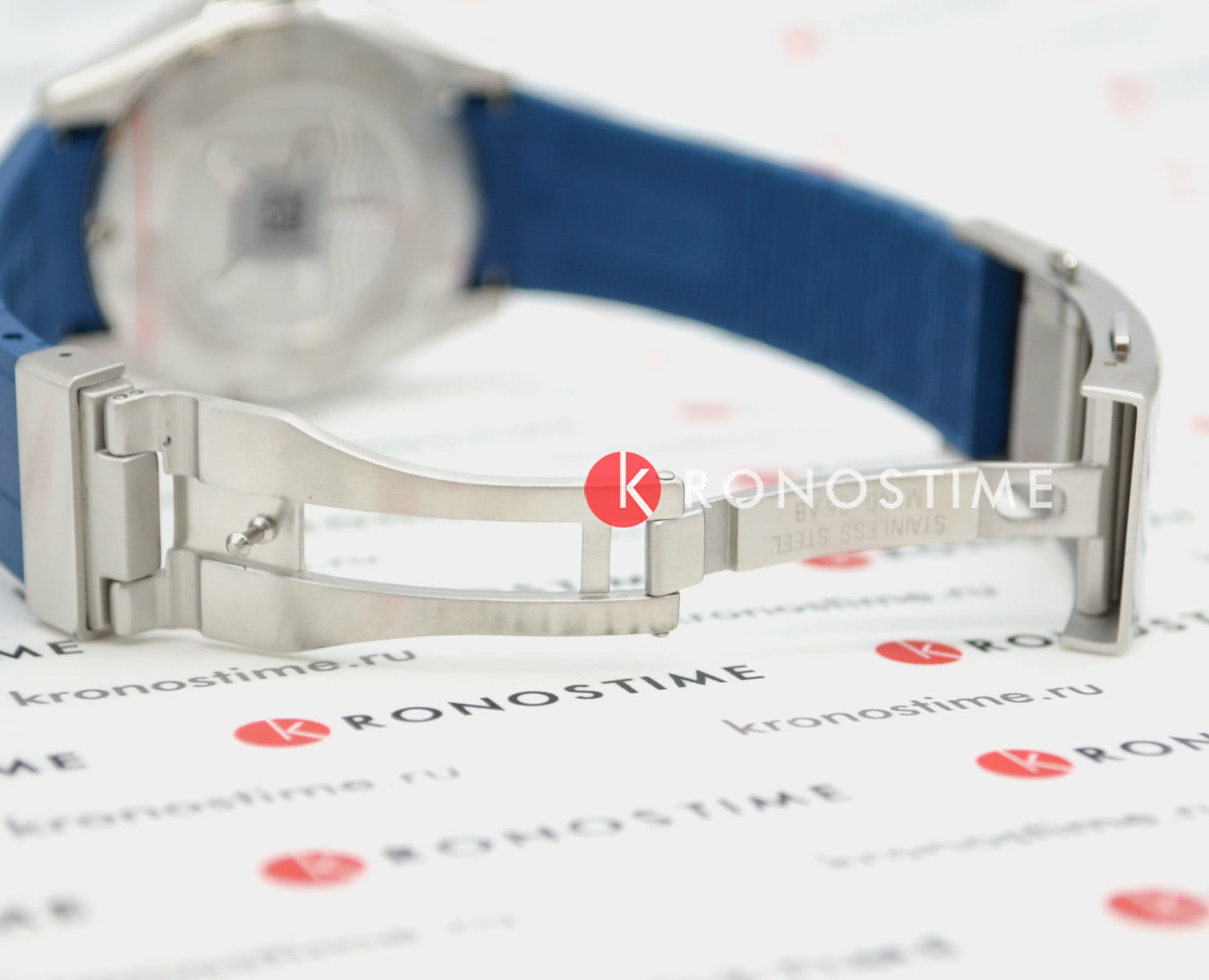 Ремешок из синего каучука с раскладывающейся застёжкойРаскладная застёжкаТакой тип застёжки используется только на браслетах из металла. Она никогда не раскрывается полностью, происходит разделение на 2 и более частей. Раскладывающая застёжка снизит вероятность потери часов к минимуму. и удлинением для дайвинга обеспечивает комфортное и надёжное ношение.