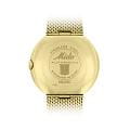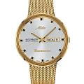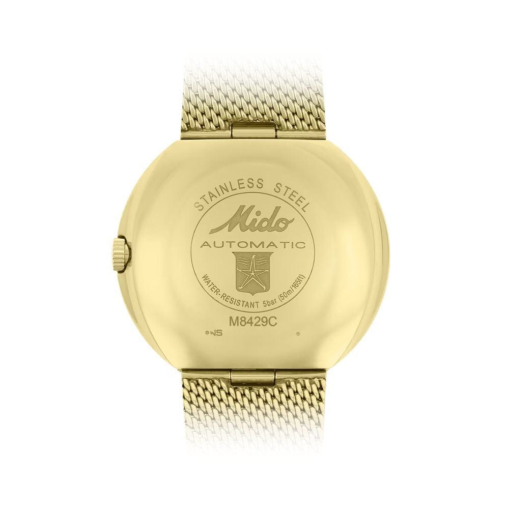 Циферблат с фирменным логотипом Mido 1950-х годов украшен накладными индексами и стрелками  с люминесцентным покрытиемЛюминесцентное покрытиеПозволяет считывать показания времени в темноте. Производители наносят на стрелки, часовые индексы, безель или поверхность циферблата светонакопительный состав, дающий холодное свечение., обеспечивающим читаемость даже в условиях слабого освещения. На «3 часах» расположено двойное окошко календаря — день недели и дата. Стальной браслет миланского плетения с PVD-покрытиемPVDУльтратонкое покрытие наносится в технике вакуумного напыления, сочетает в себе нитрид титана особой прочности со слоем золота или оксида хрома. Несёт в себе декоративную или защитную функцию. на раскладном замкеРаскладной замокДанный вариант застежки используется только на часах с металлическим браслетом. Отличительная особенность такого крепления в том, что длина браслета становится универсальной и вы можете самостоятельно отрегулировать нужный вам размер – застежка просто двигается по браслету часов..Модель защищена акриловым стеклом, сохраняющим аутентичный винтажный характер. Прозрачная задняя крышка открывает вид на автоматический механизм с автоподзаводом и 80-часовым запасом хода.