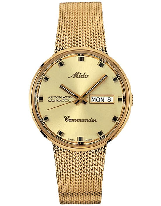 Циферблат с фирменным логотипом Mido 1950-х годов украшен накладными индексами и стрелками с люминесцентным покрытиемЛюминесцентное покрытиеПозволяет считывать показания времени в темноте. Производители наносят на стрелки, часовые индексы, безель или поверхность циферблата светонакопительный состав, дающий холодное свечение., обеспечивающим читаемость даже в условиях слабого освещения. На «3 часах» расположено двойное окошко календаря — день недели и дата. Стальной браслет миланского плетения с PVD-покрытиемPVDУльтратонкое покрытие наносится в технике вакуумного напыления, сочетает в себе нитрид титана особой прочности со слоем золота или оксида хрома. Несёт в себе декоративную или защитную функцию. на раскладном замкеРаскладной замокДанный вариант застежки используется только на часах с металлическим браслетом. Отличительная особенность такого крепления в том, что длина браслета становится универсальной и вы можете самостоятельно отрегулировать нужный вам размер – застежка просто двигается по браслету часов..Модель защищена акриловым стеклом, сохраняющим аутентичный винтажный характер. Прозрачная задняя крышка открывает вид на автоматический механизм с автоподзаводом и 80-часовым запасом хода.