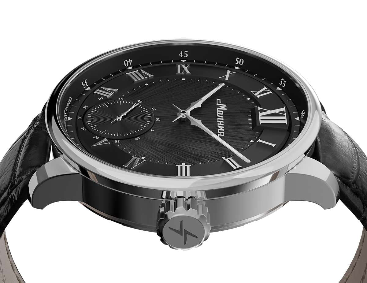 Мужские механические часы с ручным подзаводом — это аксессуар от легендарного бренда «МОЛНИЯ», созданный на Челябинском часовом заводе. Корпус диаметром 41 мм и толщиной 12 мм выполнен из нержавеющей стали 316L с зеркальной полировкой. БезельБезельВнешний ободок, закрепляющий стекло. В спортивных часах так называется поворотное кольцо с делениями на циферблате, выполняет роль таймера – замеряет отрезки времени на шкале. Неподвижный безель – элемент декора. Однонаправленно вращающийся безель на дайверских часах позволяет фиксировать моменты погружения и выныривания на поверхность. также выполнен из стали с зеркальной отделкой. Циферблат чёрного цвета оформлен римскими цифрами и стальными индексами. Малая секундная стрелка вынесена на позицию 6 часов. Циферблат защищён сапфировым стекломСапфировое стеклоПрочный и надёжный материал из кристалла сапфира синтетического происхождения, характеризующийся особой твёрдостью и устойчивостью к царапинам и повреждениям. толщиной 2,5 мм. Механизм — мануфактурный калибр 3603, собранный вручную, с запасом хода до 40 часов. Прозрачная задняя крышка позволяет наблюдать за работой механизма. Часы оснащены чёрным кожаным ремешком шириной 20 мм с раскладной застёжкойРаскладная застёжкаТакой тип застёжки используется только на браслетах из металла. Она никогда не раскрывается полностью, происходит разделение на 2 и более частей. Раскладывающая застёжка снизит вероятность потери часов к минимуму. и системой быстрой замены. Водонепроницаемость 100 м позволяет использовать часы для плавания и повседневного ношения. Идеальный выбор для тех, кто ценит российское качество и традиции.