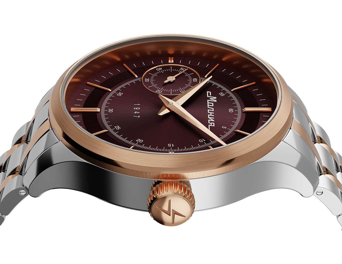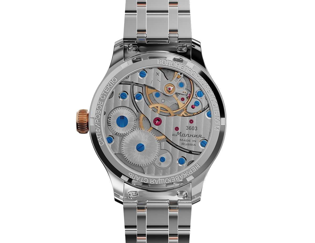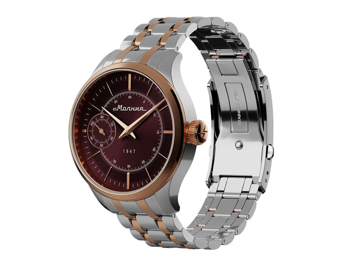 Мужские механические часы с ручным подзаводом — это аксессуар от легендарного бренда «МОЛНИЯ», созданный на Челябинском часовом заводе. Корпус диаметром 41 мм выполнен из нержавеющей стали 316L. БезельБезельВнешний ободок, закрепляющий стекло. В спортивных часах так называется поворотное кольцо с делениями на циферблате, выполняет роль таймера – замеряет отрезки времени на шкале. Неподвижный безель – элемент декора. Однонаправленно вращающийся безель на дайверских часах позволяет фиксировать моменты погружения и выныривания на поверхность. выполнен из стали с PVD-покрытиемPVDУльтратонкое покрытие наносится в технике вакуумного напыления, сочетает в себе нитрид титана особой прочности со слоем золота или оксида хрома. Несёт в себе декоративную или защитную функцию. и зеркальной отделкой. Циферблат красного цвета оформлен индексами и стрелками. Малая секундная стрелка вынесена на позицию 9 часов. Циферблат защищён сапфировым стекломСапфировое стеклоПрочный и надёжный материал из кристалла сапфира синтетического происхождения, характеризующийся особой твёрдостью и устойчивостью к царапинам и повреждениям. толщиной 2 мм. Механизм — мануфактурный калибр 3603, собранный вручную, с запасом хода до 40 часов. Прозрачная задняя крышка позволяет наблюдать за работой механизма. Часы оснащены стальным браслетом с частичным PVD-покрытиемPVDУльтратонкое покрытие наносится в технике вакуумного напыления, сочетает в себе нитрид титана особой прочности со слоем золота или оксида хрома. Несёт в себе декоративную или защитную функцию. под золото и системой быстрой замены на раскладной застёжкеРаскладная застёжкаТакой тип застёжки используется только на браслетах из металла. Она никогда не раскрывается полностью, происходит разделение на 2 и более частей. Раскладывающая застёжка снизит вероятность потери часов к минимуму. типа клипса. Водонепроницаемость 50 м позволяет использовать часы в повседневных условиях. Идеальный выбор для тех, кто ценит российское качество и традиции.