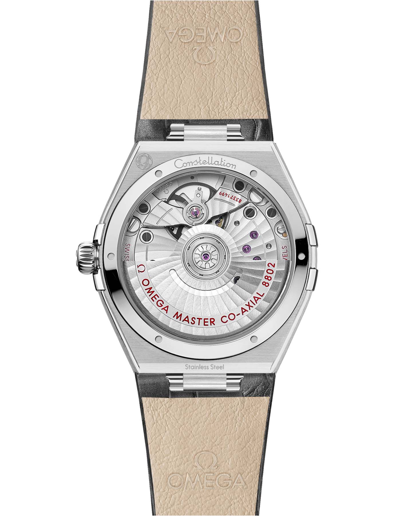 , а малый секундный циферблат и центральная минутная дорожка обведены кольцами. Часы, представленные на сером кожаном ремешке, приводятся в движение коаксиальным хронометром OMEGA Master Chronometer Calibre 8802, который виден через куполообразное сапфировое стеклоСапфировое стеклоПрочный и надёжный материал из кристалла сапфира синтетического происхождения, характеризующийся особой твёрдостью и устойчивостью к царапинам и повреждениям., устойчивое к царапинам.