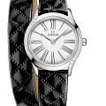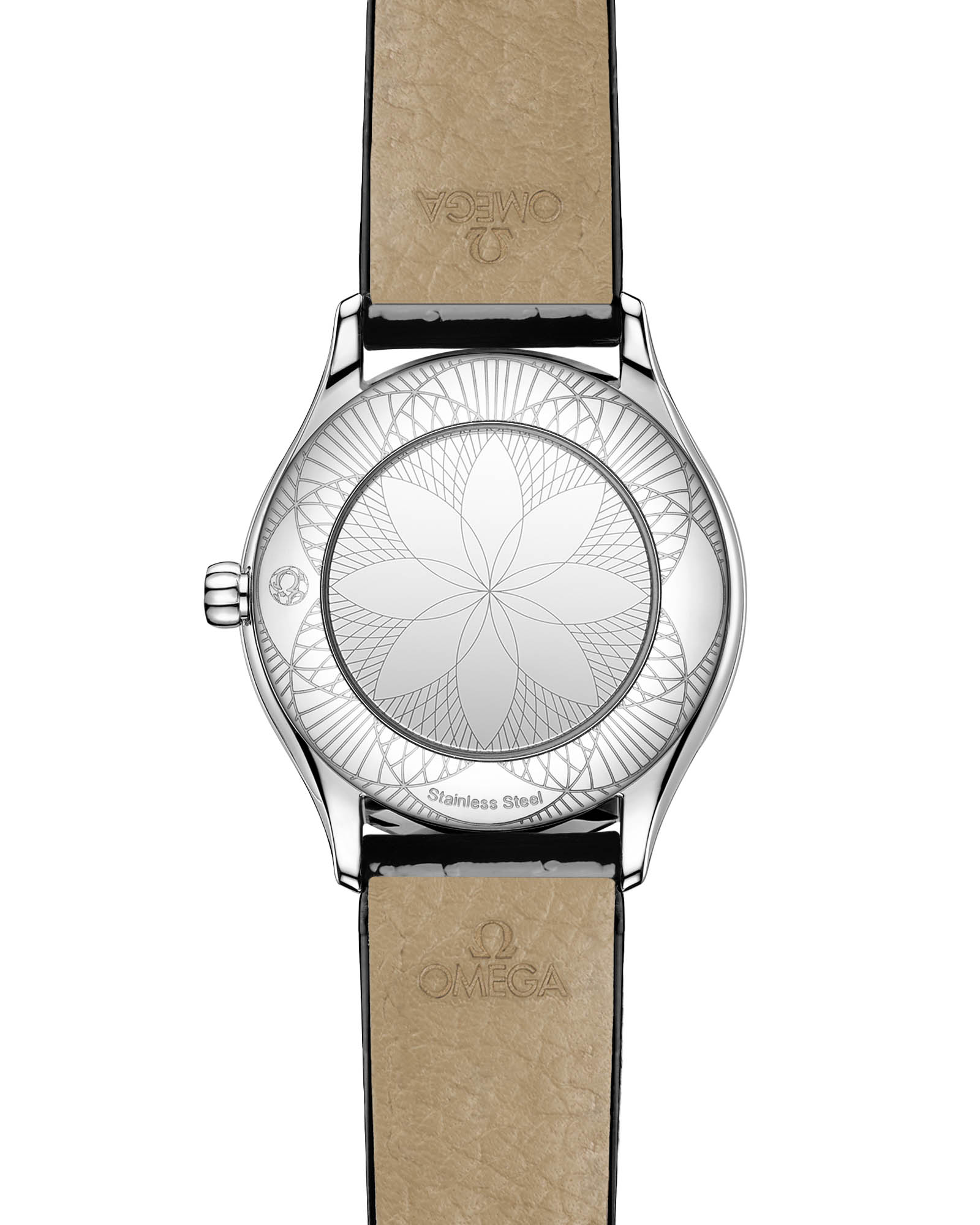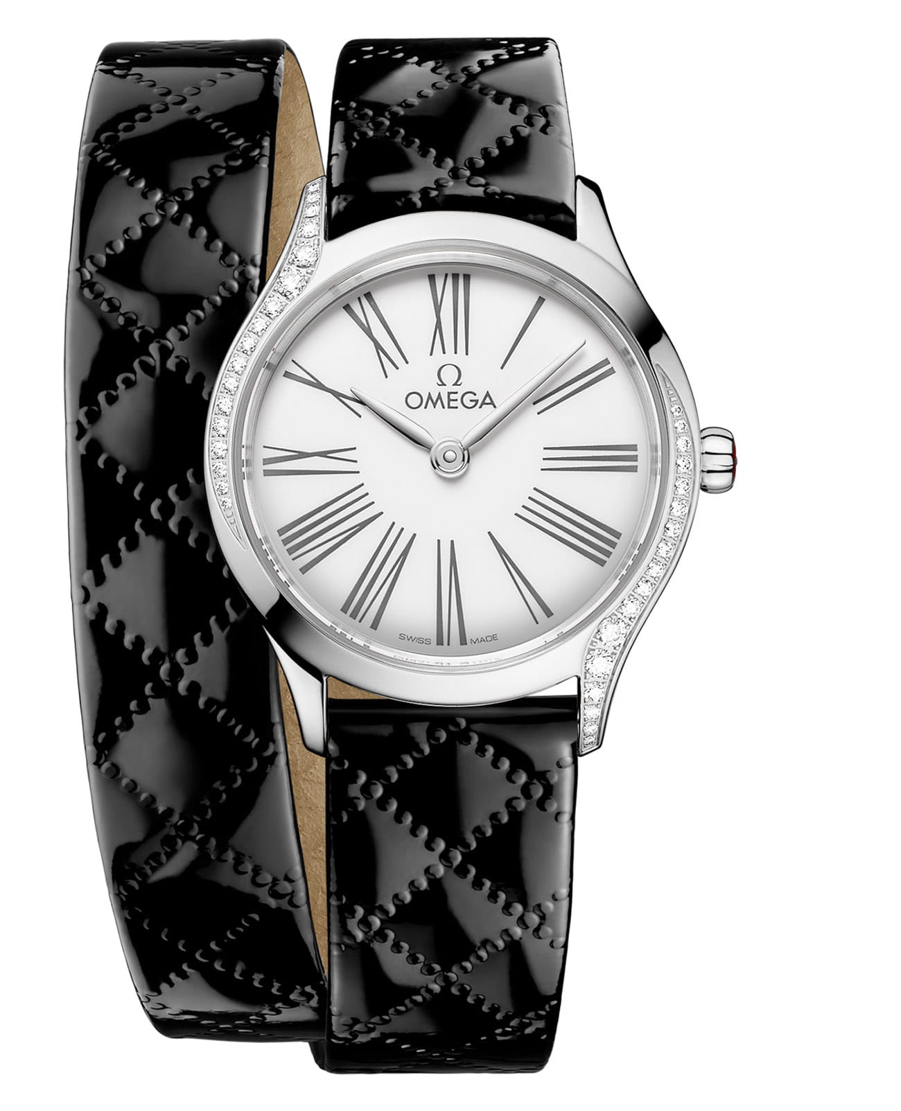Mini Trésor — очаровательная жемчужина в коллекции OMEGA, где современный дизайн встречается с изысканной миниатюрностью. 26-мм корпус из нержавеющей стали украшен волнообразными рядами сверкающих бриллиантов, а заводная головка с алмазом, обрамленная цветком из красной гибридной керамики, добавляет ноту игривого шика. Куполообразный циферблат из белой эмали "Grand Feu" с сероватым оттенком и изящными серыми римскими цифрами создает эффект невесомой элегантности. Часы дополнены двойным ремешком из лакированной кожи теленка черного цвета с ромбовидным стеганым узором, подчеркивающим их утонченный характер. Внутри бьется точный кварцевый механизм OMEGA 4061, скрытый за зеркальной задней крышкой с фирменным узором "Her Time" — истинное воплощение женственности и стиля.