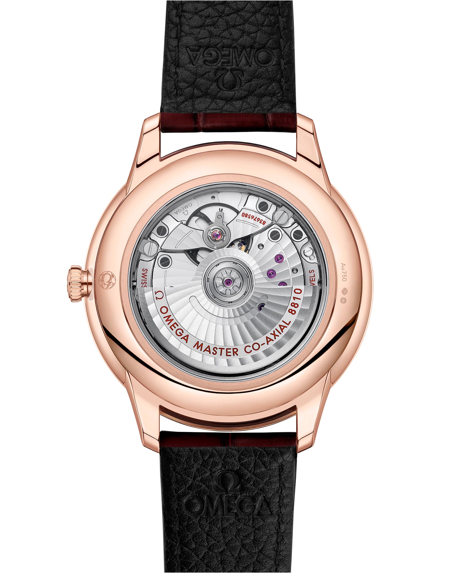 обрамляет серебристый циферблат с кристальной отделкой. Стрелки с покрытием цвета золота Sedna™" и чередующиеся римские цифры с кабошонами создают изысканную композицию. Уникальный 270-градусный индикатор запаса хода в положении "6 часов" выполнен в форме полумесяца с контрастной двухслойной конструкцией. Функциональность дополняют окошко даты, счетчик малых секунд и минутная шкала "железная дорога". Бордовый кожаный ремешок подчеркивает элегантность, а сапфировое стеклоСапфировое стеклоПрочный и надёжный материал из кристалла сапфира синтетического происхождения, характеризующийся особой твёрдостью и устойчивостью к царапинам и повреждениям. задней крышки раскрывает взору сертифицированный калибр OMEGA Master Co-Axial 8810 — символ часового совершенства.