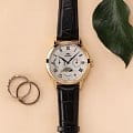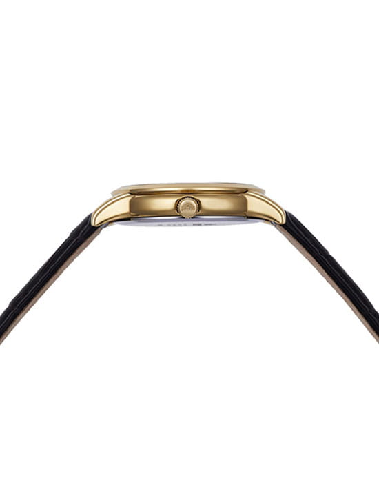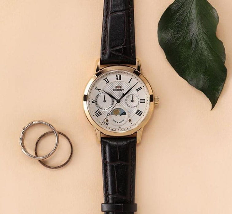 Наручные часы являются отражением винтажного стиля, гильошированный белый циферблат дополнен тонкими римскими цифрами, изысканности придаёт классический чёрный ремешок из натуральной кожи. Уникальность модели в нижнем окошке с изображением луны и солнца, так дизайнеры красиво преподносят нам смену дня и ночи. Кварцевый высокоточный калибр Orient KUE00. Сапфировое стекло. Водозащита до 5 бар. Корпус из хирургической стали 316L с цветным PVD-финишемPVDУльтратонкое покрытие наносится в технике вакуумного напыления, сочетает в себе нитрид титана особой прочности со слоем золота или оксида хрома. Несёт в себе декоративную или защитную функцию. золотистого оттенка. Отображение числа и дня недели. Диаметр корпуса: 43,8 мм.