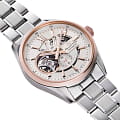 Orient Contemporary RE-AV0123G – искусство механики в современном исполнении Представляем вашему вниманию мужские механические часы с автоподзаводом Orient Star RE-AV0123G0 (RE-AV0123G00B), выполненные в духе современной классики. Эти часы привлекают внимание своим изысканным дизайном и высоким качеством исполнения. Основой часов служит прочный корпус и браслет из нержавеющей стали, придающие изделию солидность и долговечность. Безель украшен PVD-покрытиемPVDУльтратонкое покрытие наносится в технике вакуумного напыления, сочетает в себе нитрид титана особой прочности со слоем золота или оксида хрома. Несёт в себе декоративную или защитную функцию., что добавляет часам элегантности и завершает общий образ. Механизм часов оснащен 22 камнями и работает с частотой 21 600 полуколебаний в час, обеспечивая высокую точность хода. Автоподзавод обеспечивает запас хода до 50 часов, позволяя забыть о необходимости ежедневной ручной заводки. Функция stop-second дает возможность точно установить время. Особенностью данной модели является прозрачное окошко на циферблате, через которое можно наблюдать за работой сложного внутреннего механизма. Секундная стрелка расположена на отдельном циферблате, что добавляет часам уникальности и оригинальности. Циферблат выполнен по технологии Sunray («солнечные лучи»), создавая эффект игры света и тени. Часовые метки представлены в виде штрихов и римской цифры XII, что подчеркивает классический стиль часов. Класс водозащиты WR100 позволяет использовать часы не только в повседневной жизни, но и во время активного отдыха, включая плавание, ныряние и другие водные виды спорта. Часы способны выдерживать давление воды на глубине до 100 метров. Браслет из нержавеющей стали оснащен удобной раскладной застежкой раскладной застёжкеРаскладная застёжкаТакой тип застёжки используется только на браслетах из металла. Она никогда не раскрывается полностью, происходит разделение на 2 и более частей. Раскладывающая застёжка снизит вероятность потери часов к минимуму., обеспечивающей надежную фиксацию на запястье и облегчая процесс надевания/снимания часов.