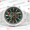 Мужские наручные часы-хронографХронографФункция позволяет измерять отрезки времени с особой точностью: часы, минуты, секунды. Верным признаком хронографа является наличие на циферблате 3 дополнительных окошек-счётчиков. Orient WV0031TX из коллекции NEO 70's Solar Panda сочетают в себе ретро-дизайн и современные технологии. Модель обладает круглым корпусом диаметром 42 мм и толщиной 11.7 мм, изготовленным из нержавеющей стали, что обеспечивает высокую устойчивость к внешним воздействиям. Браслет выполнен из нержавеющей стали с раскладной застежкойРаскладная застёжкаТакой тип застёжки используется только на браслетах из металла. Она никогда не раскрывается полностью, происходит разделение на 2 и более частей. Раскладывающая застёжка снизит вероятность потери часов к минимуму., гарантирующей комфортное ношение и безопасность. Зеленый циферблат с элементами в стиле 70-х годов, такими как тонкие индексы и T-образные кнопки, оснащен функцией люминесцентного покрытияЛюминесцентное покрытиеПозволяет считывать показания времени в темноте. Производители наносят на стрелки, часовые индексы, безель или поверхность циферблата светонакопительный состав, дающий холодное свечение. для лучшей видимости в темноте. Для защиты применяется стекло из минерального материала, обеспечивающее прочную защиту от царапин. Часы работают на японском солнечном кварцевом механизме, который также поддерживает функцию секундомераСекундомерСекундоме́р — прибор, способный измерять интервалы времени с точностью до долей секунды. и отображение даты. Водонепроницаемость составляет 10 атмосфер (100 метров), что позволяет использовать их во время плавания, но не рекомендуется для глубоководного дайвинга.