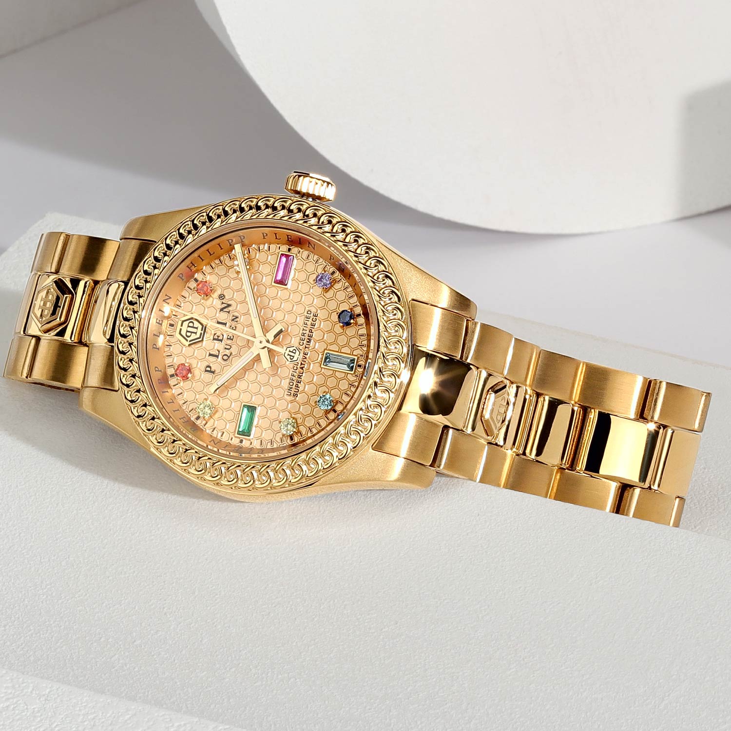 Яркие женские часы Philipp Plein Queen PWDAA0721, кварцевый механизм с высокой точностью. Класс водозащиты: 50 метров, позволит защитить корпус от случайных брызг или капель дождя. Корпус часов изготовлен из стали, цвета.